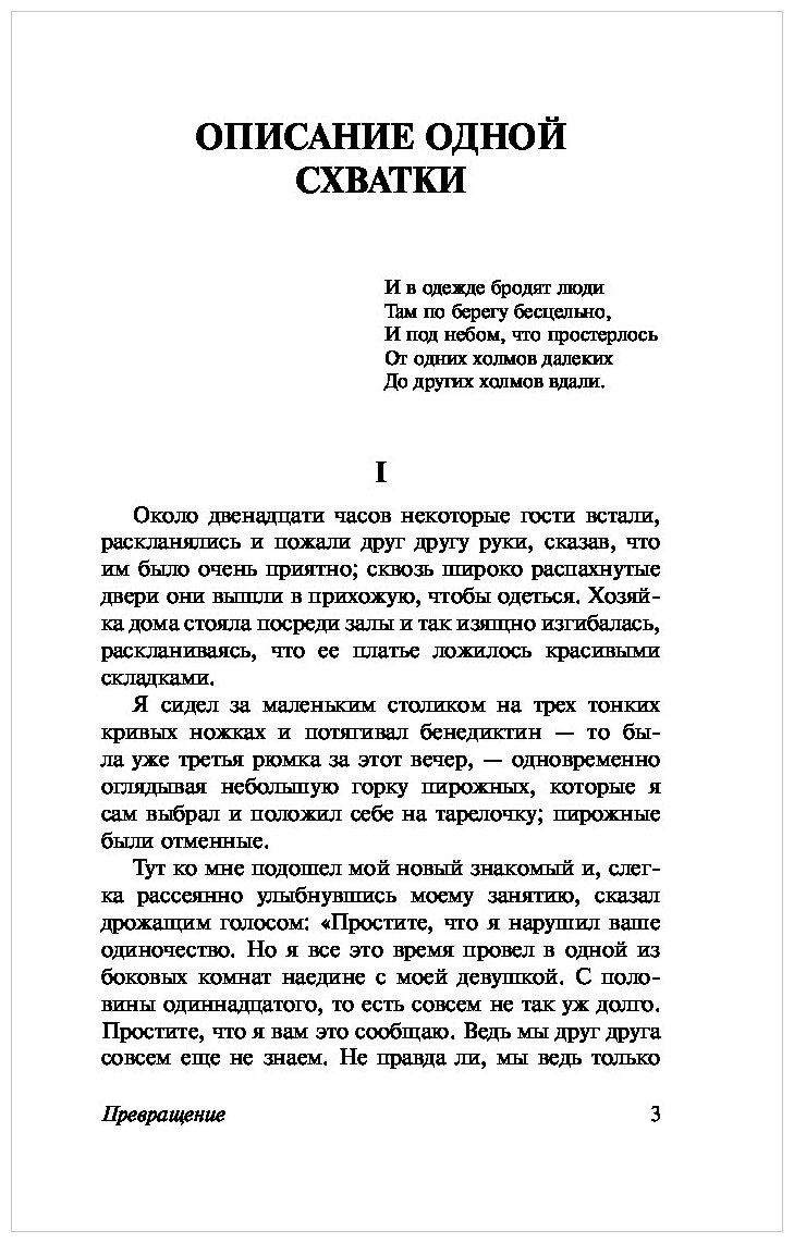 «Проснувшись однажды утром после беспокойного сна, Грегор Замза обнаружил, что он у себя в постели превратился в страшное насекомое. Лежа на панцирнотвердой спине, он видел, стоило ему приподнять голову, свой коричневый, выпуклый, разделенный дугообразными чешуйками живот, на верхушке которого еле держалось готовое вот-вот окончательно сползти одеяло. Его многочисленные, убого тонкие по сравнению с остальным телом ножки беспомощно копошились у него перед глазами…»
