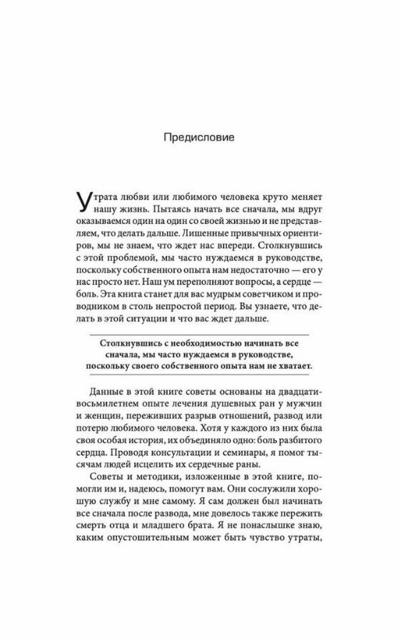 Утрата любви или любимого человека круто меняет нашу жизнь. Пытаясь начать все сначала, мы вдруг оказываемся один на один со своей жизнью и не представляем, что делать дальше... Столкнувшись с этой непростой проблемой, мы часто нуждаемся в руководстве, поскольку собственного опыта у нас просто нет. Наш ум переполняют вопросы, а сердце - боль. Эта книга станет для вас мудрым советчиком и проводником в столь трудный период. Исцеление душевных ран и подавленных чувств, без которого удача в новых отношениях практически нереальна, поможет вам выйти на новый уровень любви и полноты жизни.