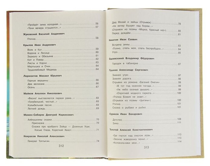 | Автор(ы) | Афанасий Афанасьевич Фет, Михаил Юрьевич Лермонтов, Николай Алексеевич Некрасов, Федор Иванович Тютчев, Сергей Александрович Есенин, Михаил Михайлович Пришвин, Дмитрий Наркисович Мамин-Сибиряк, Иван Андреевич Крылов, Александр Сергеевич Пушкин, Алексей Константинович Толстой, Корней Иванович Чуковский, Лев Николаевич Толстой, Антон Павлович Чехов |