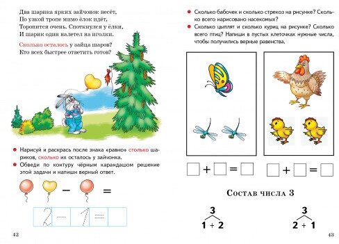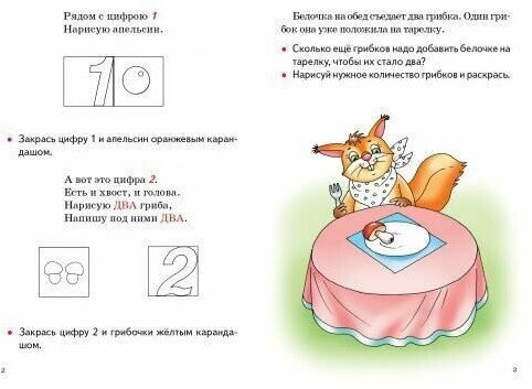 Основной упор в книге - познакомить детей со счётом до 10. Задания – соедини количество и нужную цифру и дорисуй необходимое количество предметов до определенного значения. Детям 3-лет очень трудно усидеть за заданиями в книжке (хотя у всех дети разные), чтобы научиться считать. Их легче учить счету с живыми предметами – игрушками, овощами, фруктами, да и теми же камешками на улице. Эта книга может подойти уже как закрепление пройденного материала.