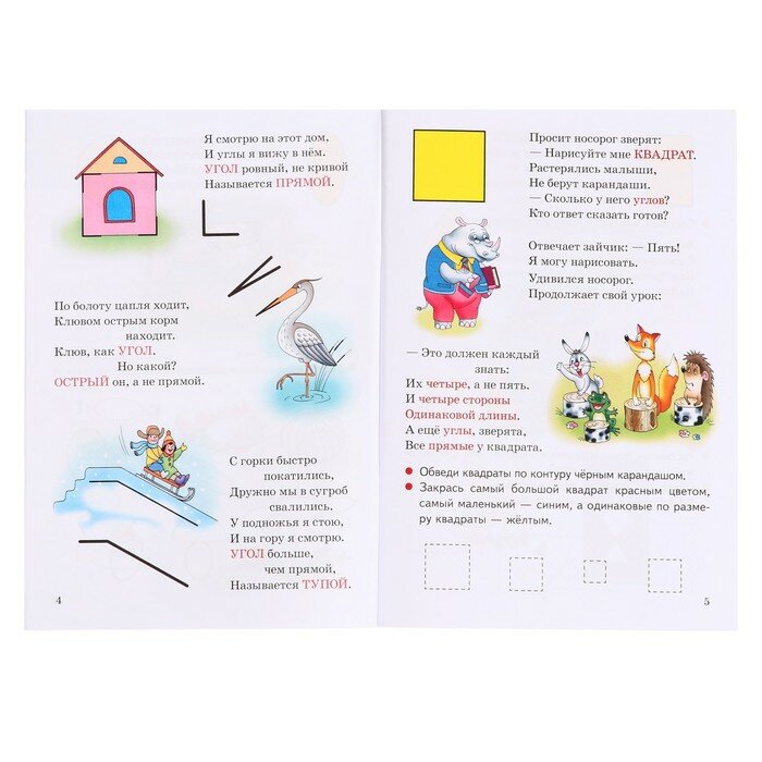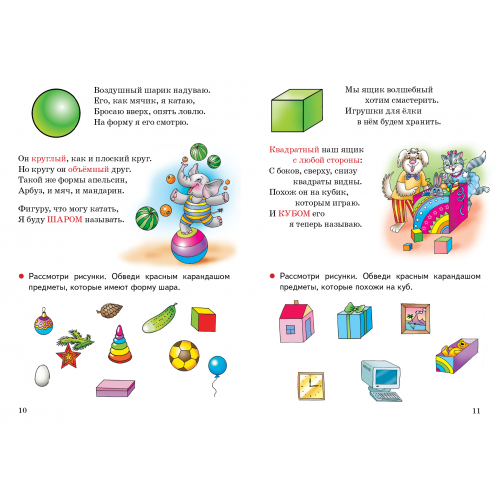 Сначала идет знакомство с геометрическими фигурами (плоскими и объемными) в стихах. Рядом задание на закрепление. Описание очень доступное и понятное ребенку.