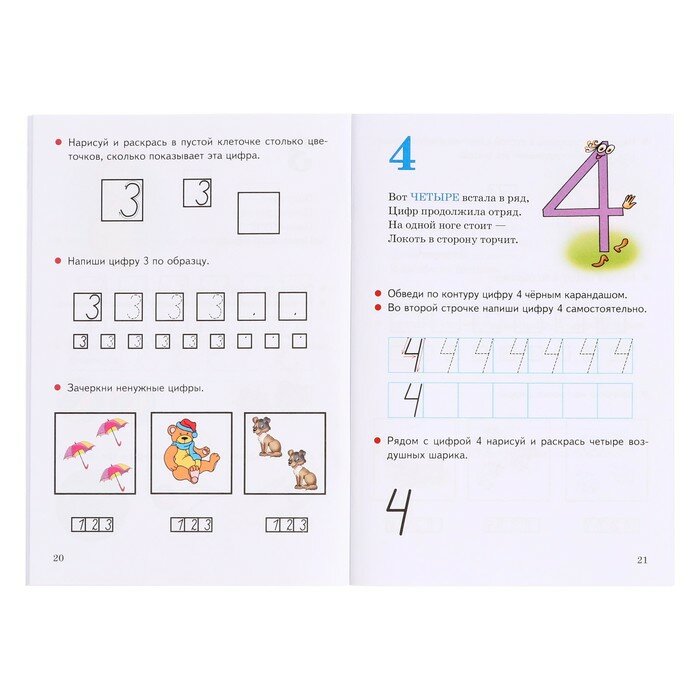 Затем идёт знакомство с цифрами от 1 до 10. Стих про цифру. На каждую цифру придумана ассоциация – на что это цифра похожа. Есть очень интересные и запоминающиеся примеры (например, цифра один – стрела с обломанным концом). Прописи в трех размерах (больше, меньше и самая маленькая, почти стандартная клетка) и задания.