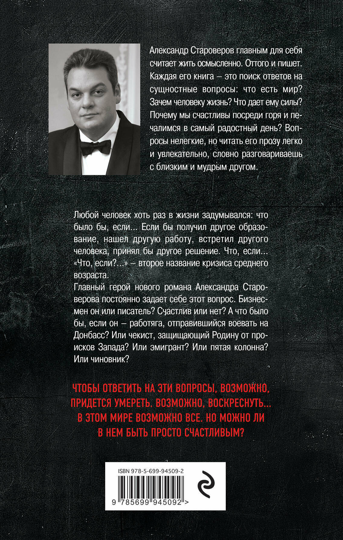Главный герой нового романа Александра Староверова постоянно задаёт себе этот вопрос. Бизнесмен он или писатель? Счастлив или нет? А что было бы, если он - работяга, отправившийся воевать на Донбасс? Или чекист, защищающий Родину от происков Запада? Или эмигрант? Или пятая колонна? Или чиновник?