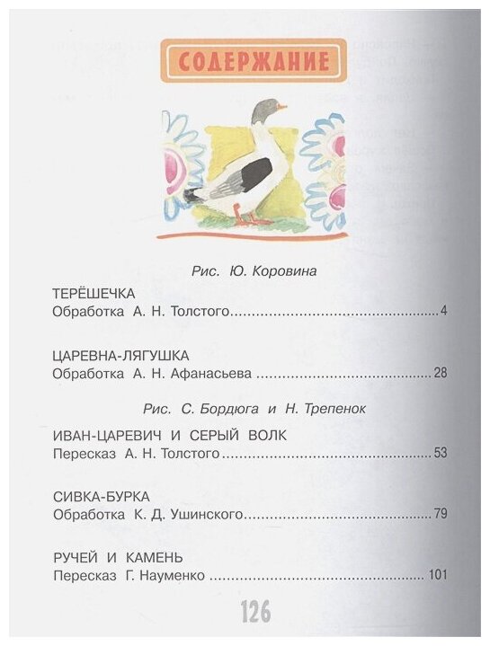 Хорошая книга в твердой обложке, листы хороший плотный офсет, цветные иллюстрации. Это сборник различных произведений и многих авторов. Первой идет достаточно редкая русская-народная сказка "Терешечка" с жутковатыми людоедскими моментами в пересказе Льва Толстого, потрясающие иллюстрации засл.художника РСФСР Ювеналия Коровина. Далее сказки оформлены уже другими художниками -С.Бордюг, Н.Трепенюк, которые лично у меня не вызывают больших эмоций. В сборнике достаточно много сказок (всего 10)в пересказе Афанасьева, Толстого, Науменко и Ушинского.