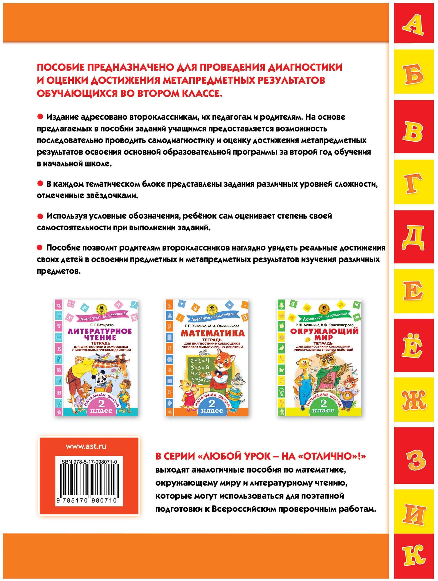 Пособие предназначено для текущего оценивания сформированности у второклассников универсальных учебных действий, определённых ФГОС НОО. Разные по сложности задания, состоят из двух частей: учебного задания и вопросов для самоконтроля. Это позволяет не только диагностировать у второклассников универсальные учебные действия (УУД), но и совершенствовать навыки их познавательной деятельности.