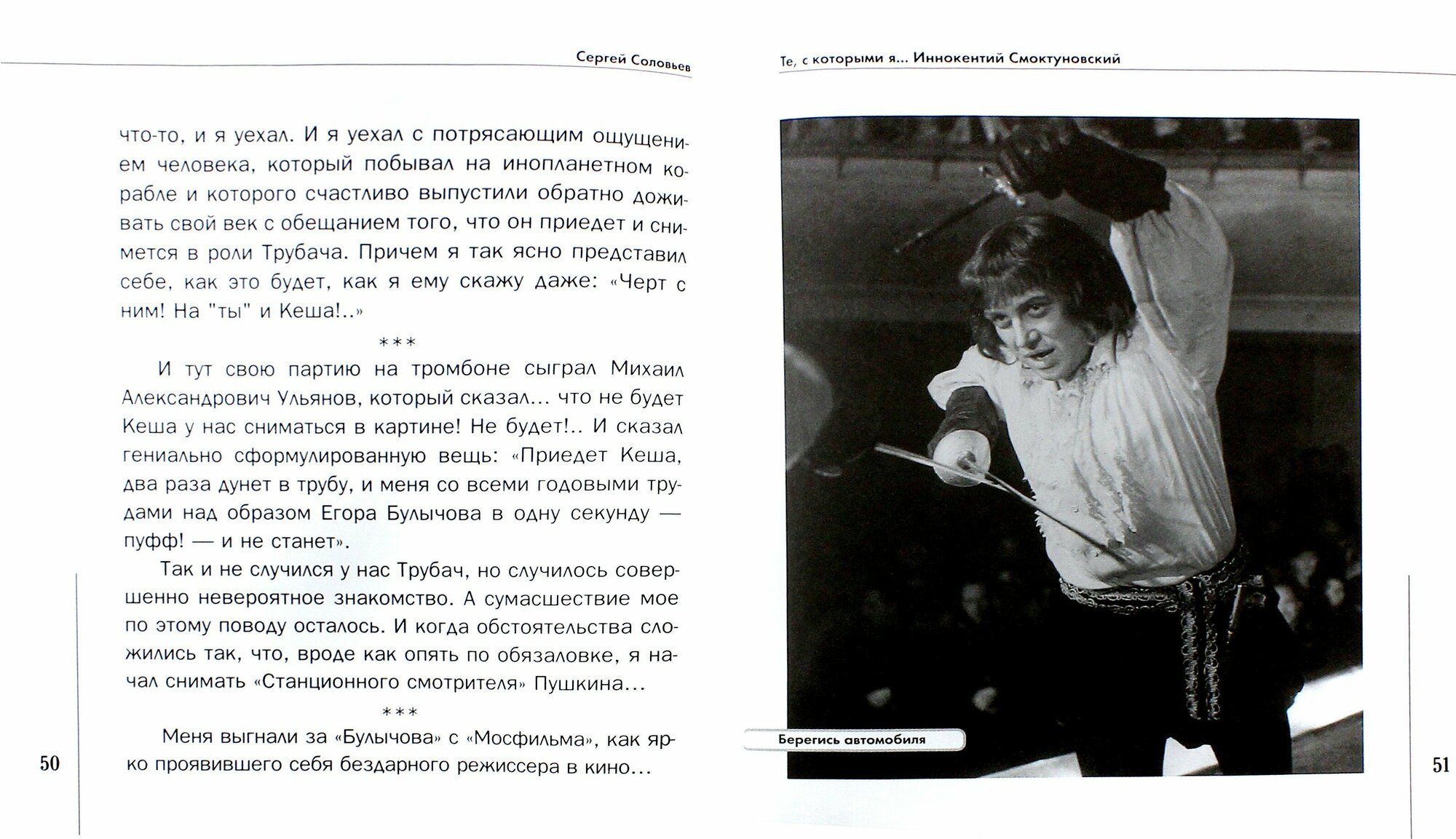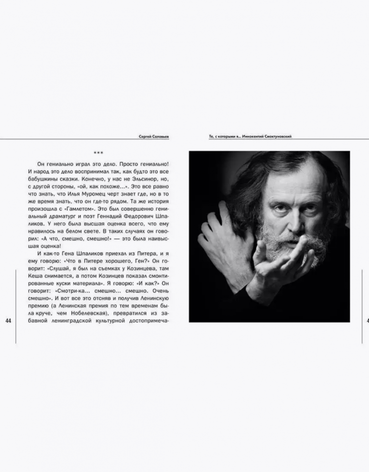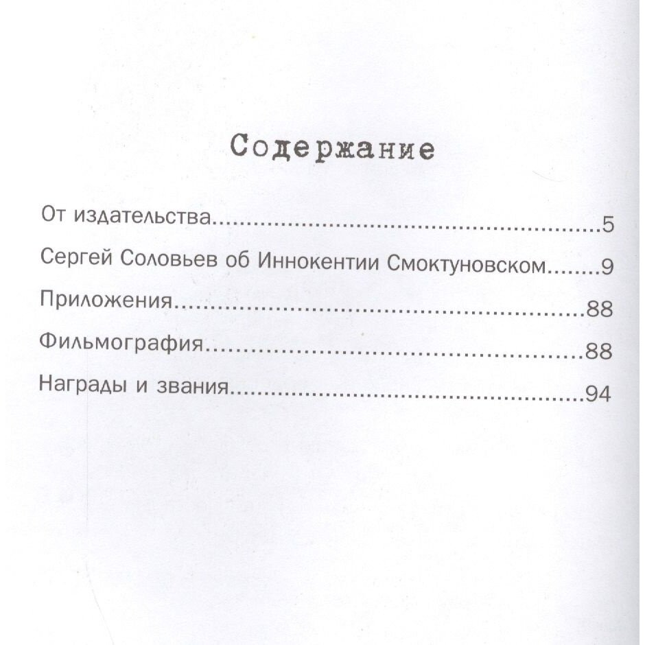 Имя Иннокентия Михайловича Смоктуновского - феноменального актера с исключительным талантом, настоящего гения - навсегда вписано в историю отечественного кино. Вдвойне счастливы те, кому посчастливилось общаться с легендарным актером лично. Книга известного кинорежиссера Сергея Александровича Соловьева, созданная по мотивам его фильма об Иннокентии Смоктуновском из цикла "Те, с которыми я..." для телеканала "Культура", пронизана трепетным отношением к выдающемуся современнику, с которым автора сводила судьба на съемочной площадке и за ее пределами. Его словесные портреты лишены банальных черт, общеизвестных фактов, они согреты неповторимой личностной интонацией автора, который рассказывает о своих коллегах по искусству свободно, раскованно, иронично, но и нежно, с массой ярких деталей и подробностей, известных только ему. Книга дополнена также фильмографией артиста, списком наград и званий.