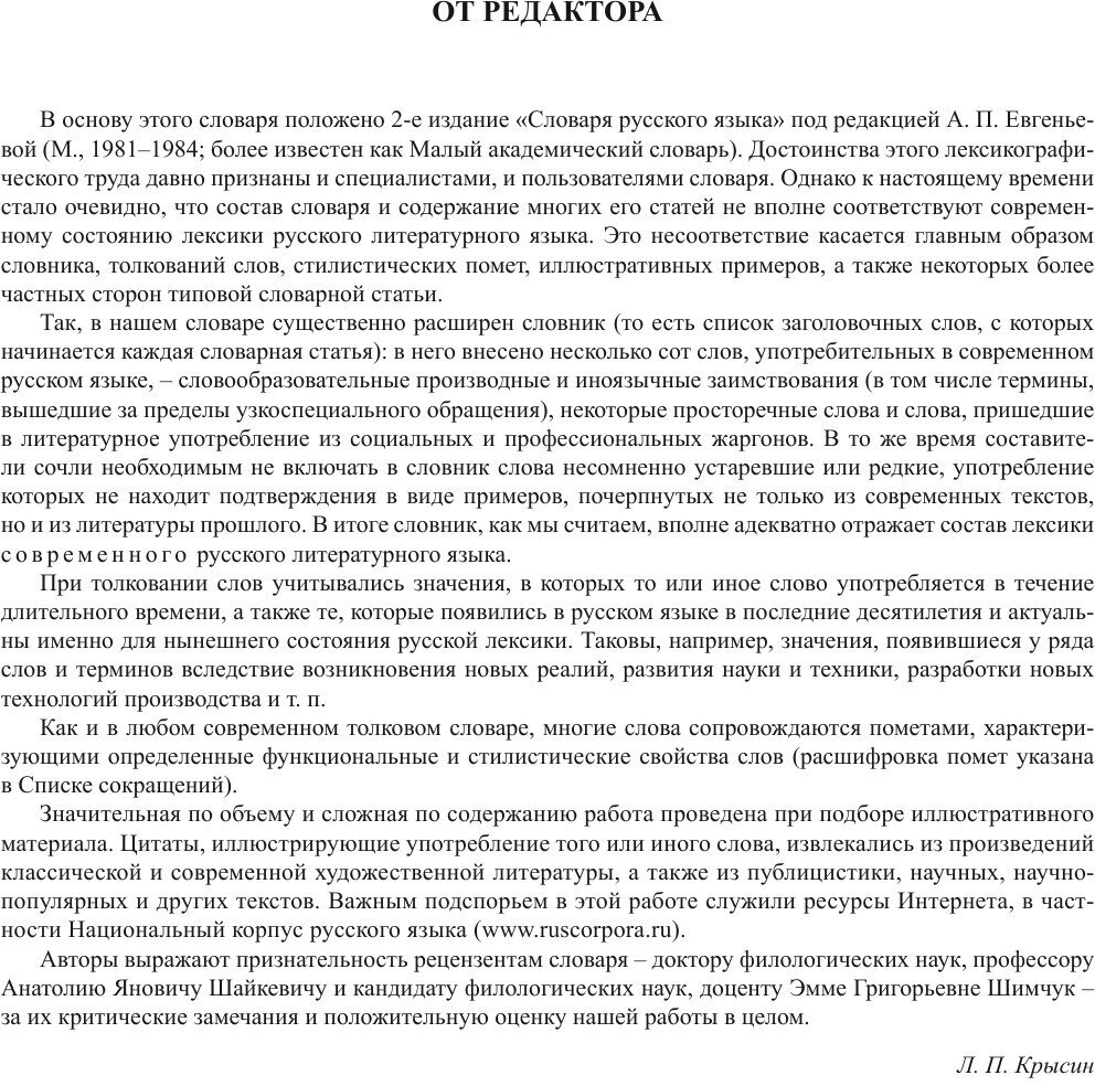 В словаре содержится описание лексики современного русского литературного языка. Словарь является нормативным: содержащаяся в нем информация соответствует современным лексико-семантическим, грамматическим, стилистическим и сочетаемостным нормам литературного русского языка. В основе словаря - "Словарь русского языка" под ред. А. П. Евгеньевой (Малый академический словарь), в значительной степени дополненный и измененный в соответствии с современным состоянием русского языка и его лексики. Эти изменения и дополнения касаются словника, толкований, иллюстративного материала, грамматических и стилистических характеристик слова.
