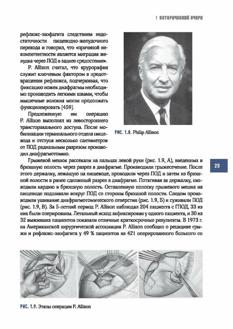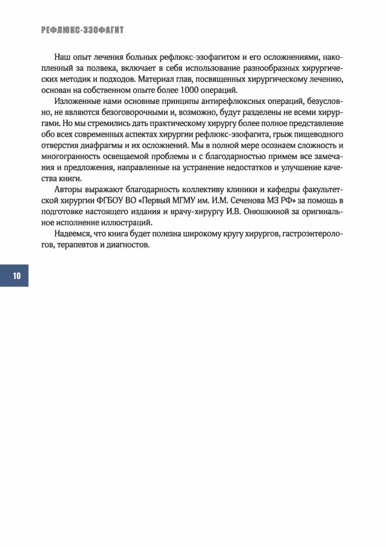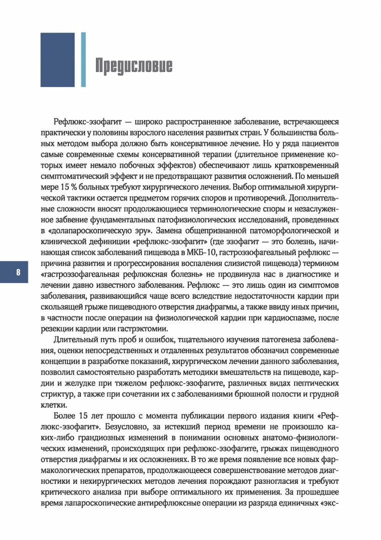 Книга посвящена наиболее распространенным заболеваниям в гастроэнтерологии: рефлюкс-эзофагиту, грыжам пищеводного отверстия диафрагмы и их осложнениям. Приведены исторические сведения, подробно описана анатомия и физиология области кардии. С современных позиций изложены вопросы этиологии и патогенеза. Рассмотрены возможности диагностики, подробно описано консервативное лечение с применением фармацевтических препаратов последних поколений. Отдельное внимание уделено показаниям и выбору метода хирургического лечения, подробно описана техника операций. Обобщен и проанализирован накопленный опыт более 1000 операций. С критических позиций рассмотрены послеоперационные осложнения и причины неудач антирефлюксных операций, а также методы их коррекции.