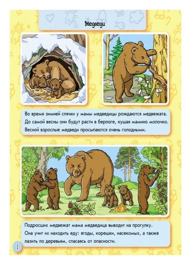 Одна из лучших книг-энциклопедий про животных у нашей библиотеке для малышей. С одной стороны картонных странички можно использовать для совсем малюток, с другой темы есть, которые интересны и 3х летке. Дочка интересовалась книгой с 1,5 до почти 3х. Потом просто появились другие книги, а так может и дальше б просила читать. Рекомендую, как первые книжки, для знакомства с животными! Мне самой понравилась странички, где на картинке показано как заселен полностью лес (от норок в земле до высоких деревьев) или река (от дна до берега). Это дает полное представление в целом, а не по кусочкам.
