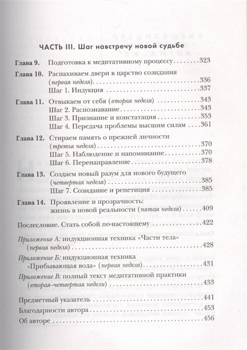 Так же в конце книги отдельно даны все медитации (без пошаговой инструкции) для более быстрого и удобного нахождения и дальнейшей работы с ними.