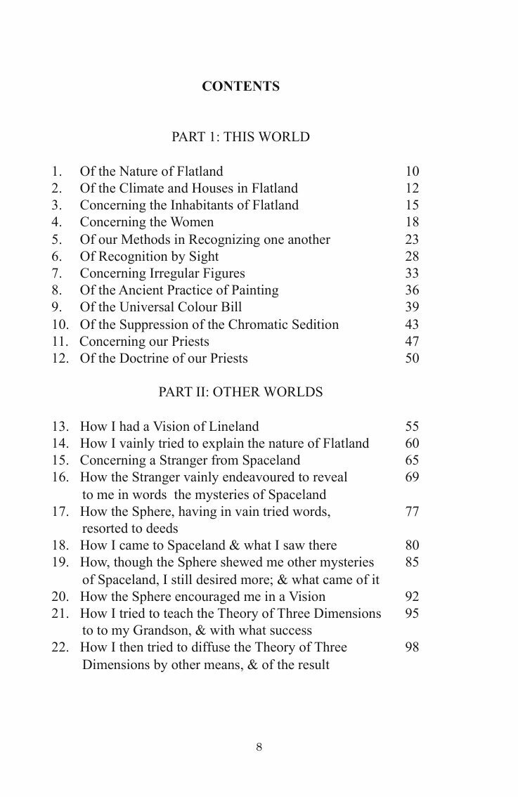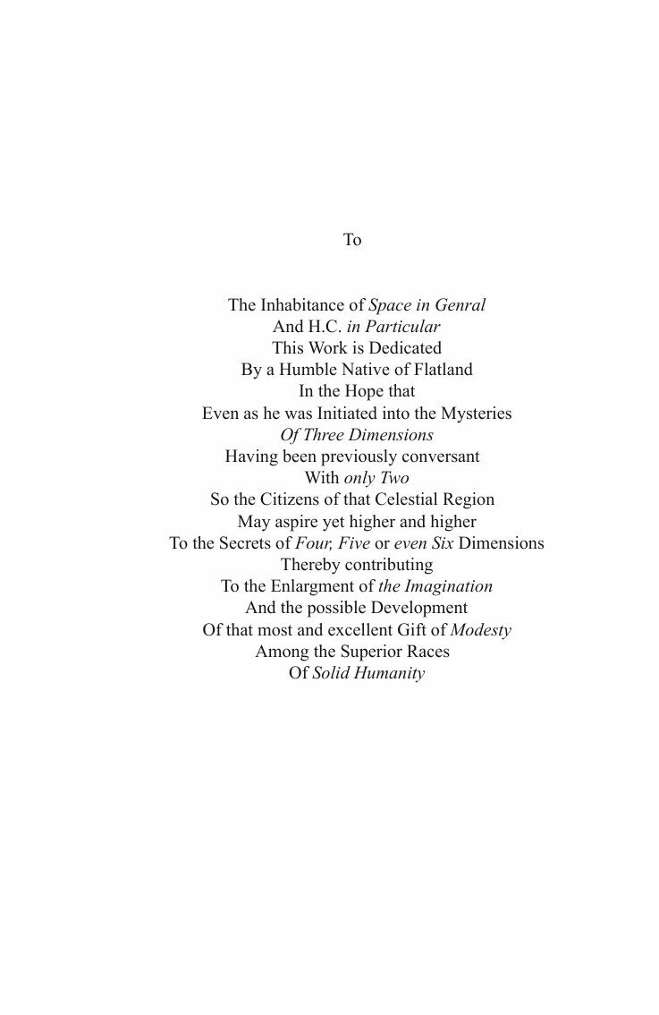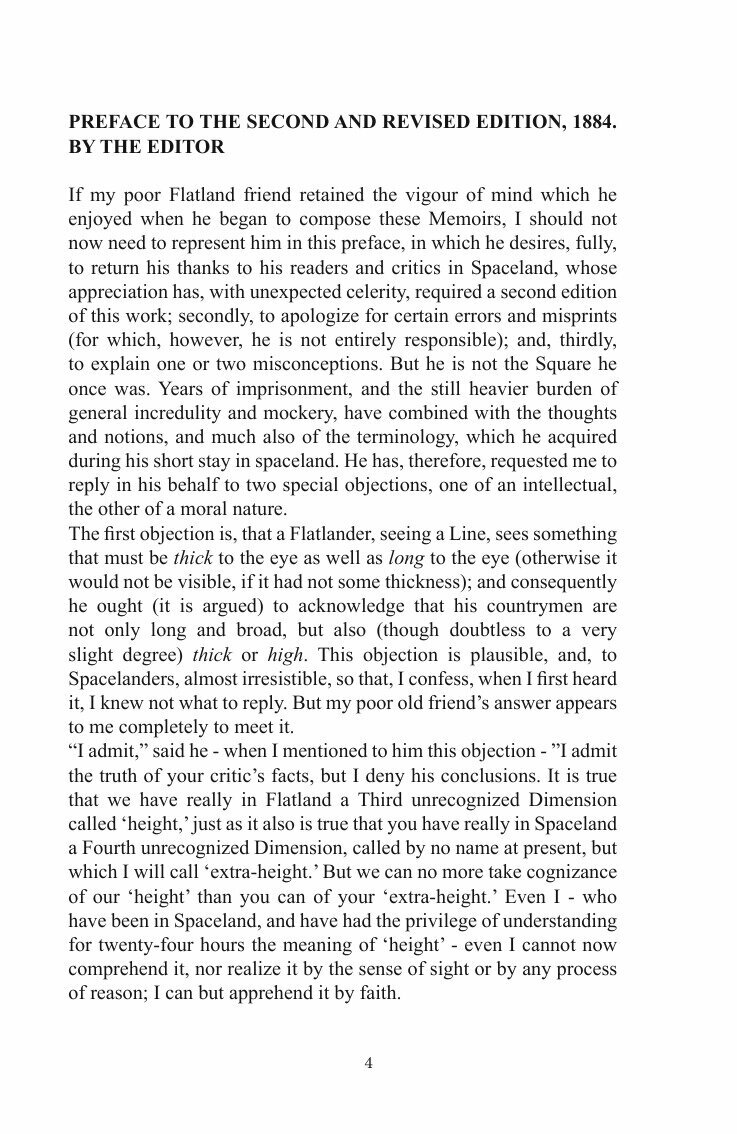 If my poor Flatland friend retained the vigour of mind which he enjoyed when he began to compose these Memoirs, I should not now need to represent him in this preface, in which he desires, fully, to return his thanks to his readers and critics in Spaceland, whose appreciation has, with unexpected celerity, required a second edition of this work; secondly, to apologize for certain errors and misprints (for which, however, he is not entirely responsible); and, thirdly, to explain one or two misconceptions. But he is not the Square he once was. Years of imprisonment, and the still heavier burden of general incredulity and mockery, have combined with the thoughts and notions, and much also of the terminology, which he acquired during his short stay in spaceland. He has, therefore, requested me to reply in his behalf to two special objections, one of an intellectual, the other of a moral nature.