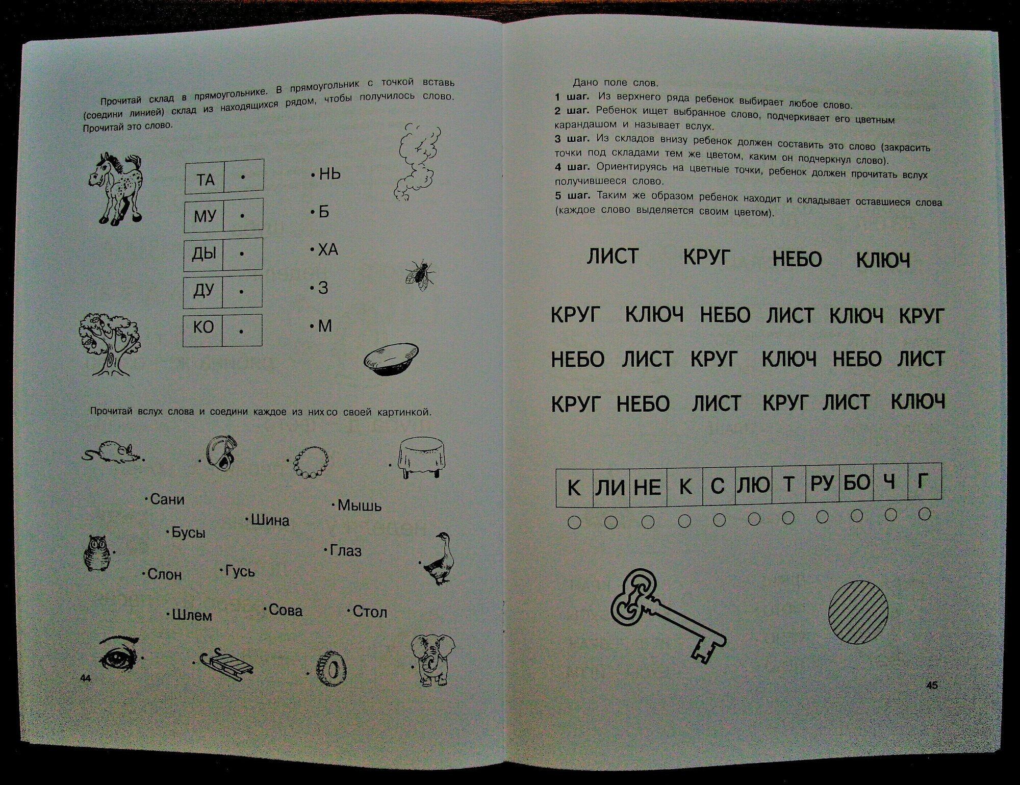 Книга в мягкой обложке, страницы белые, плотные. Печать черно-белая. Шрифт заданий очень крупный - ребенку читать удобно. Хорошее пособие для начинающих читать детей. Задания в книге однотипные, но с возрастающей сложностью. Сыну нравится выполнять задания, а значит и результат будет.