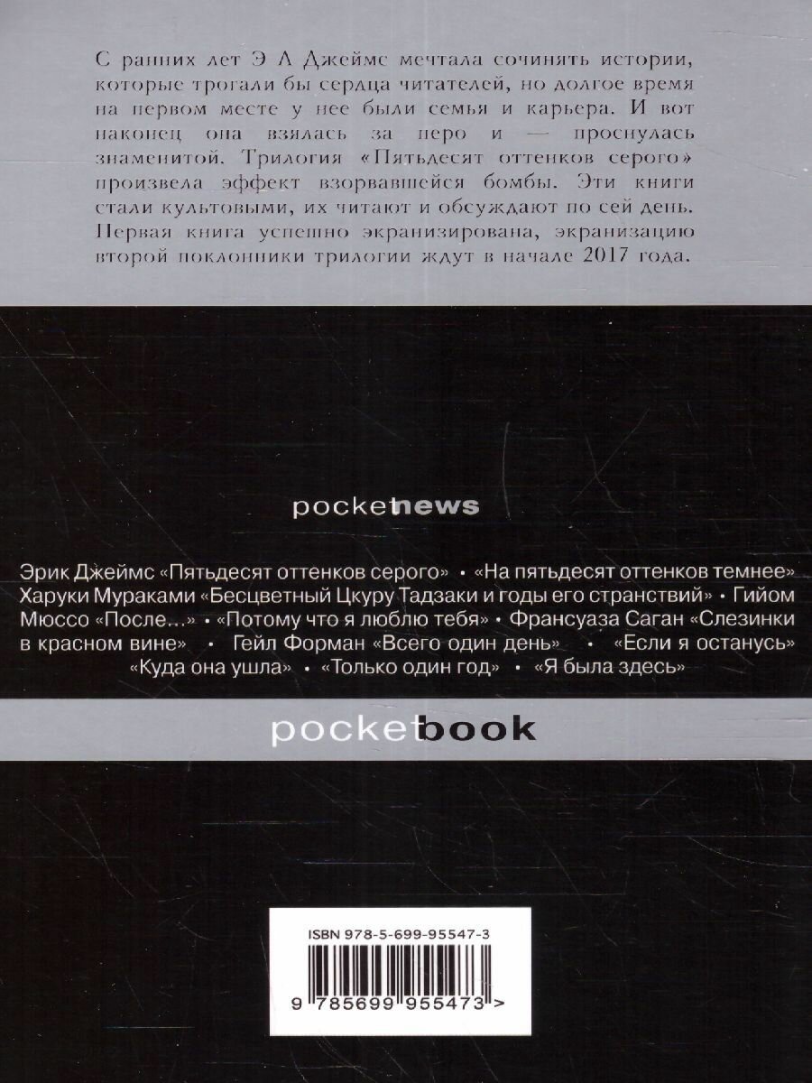 С ранних лет Э. Л. Джеймс мечтала сочинять истории, которые трогали бы сердца читателей, но долгое время на первом месте у нее были семья и карьера. И вот наконец она взялась за перо и — проснулась знаменитой. Трилогия «Пятьдесят оттенков серого» произвела эффект взорвавшейся бомбы. Эти книги стали культовыми, их читают и обсуждают по сей день.