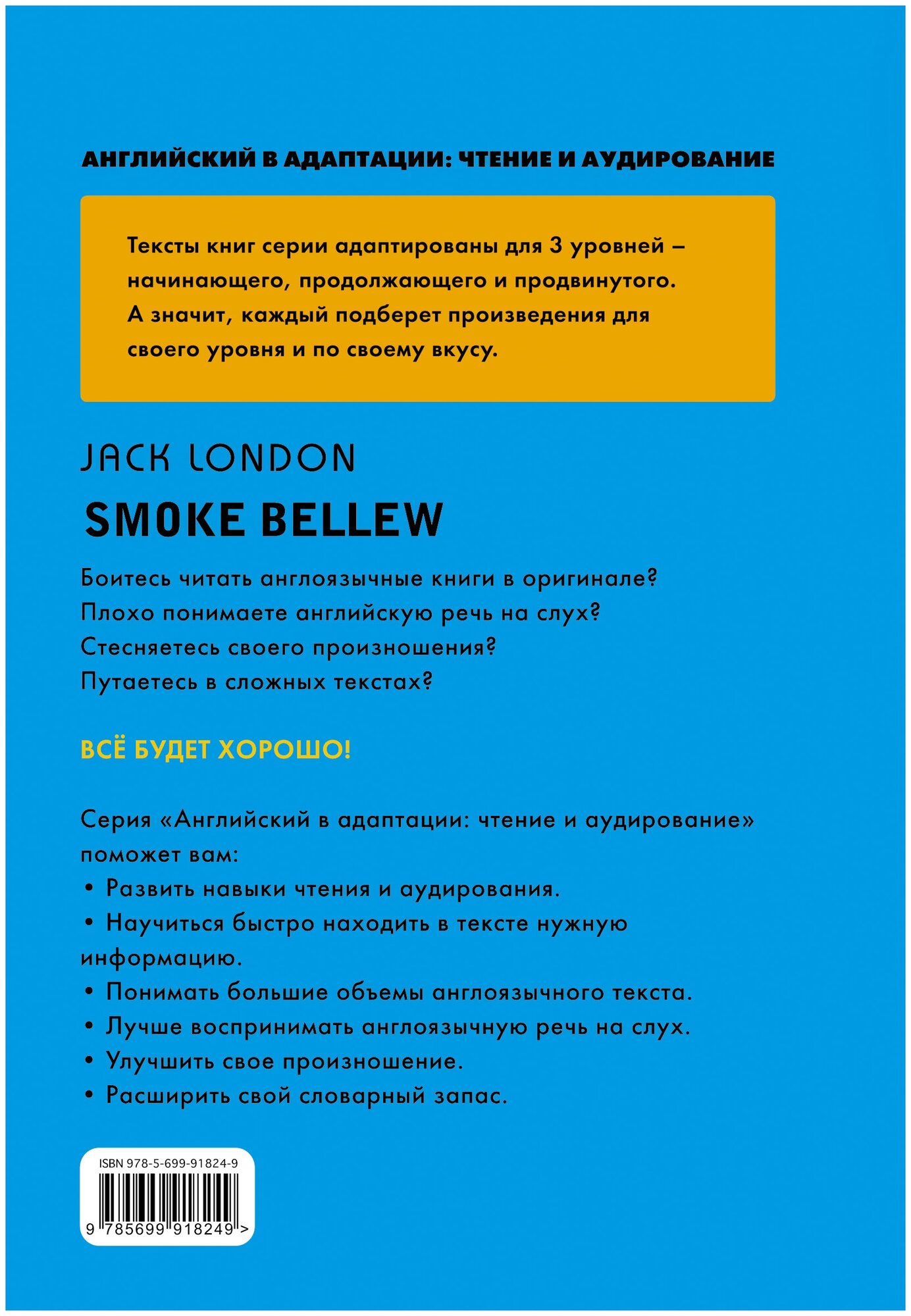 Суровый и прекрасный Север, мужественные герои и опасные приключения - все это есть в рассказах Джека Лондона о Смоке Беллью. В этой книге собраны лучшие истории о нем. Тексты рассказов адаптированы для тех, кто пока не очень уверенно читает по-английски. В серии классические произведения англоязычных авторов адаптированы для 3 уровней - начинающего, продолжающего и продвинутого - и предназначены для развития навыков чтения и аудирования. Читая книги и выполняя предложенные задания, читатели научатся понимать большие объемы англоязычного текста, находить в тексте нужную информацию, активизировать изученную лексику и грамматику. Записанный в исполнении носителей языка текст книги и задания на аудирование помогут улучшить произношение и научиться воспринимать английскую речь на слух.