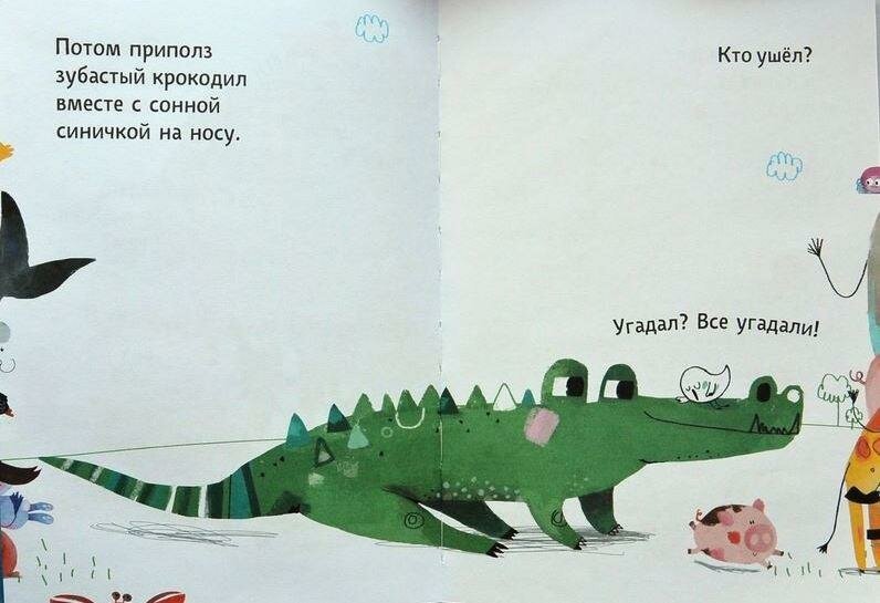 Знаете, есть книги большие, красивые, с иллюстрациями известных художников, написанные популярными детскими авторами, иногда такие книги даже читать страшно с детьми, в том плане, что жалко, если ребенок нечаянно помнет или порвет.. а эта книга - обычная, с одними и теми же животными на развороте, только некоторые уходят со страничек, а некоторые приходят. Но если вы хотите, чтобы ребенок научился включать свою логику, книга точно поможет сделать это! В ней по частям животных нужно угадать кто сейчас придет и кто уйдет. Причем приходят животные справа, а уходят влево, поэтому и эти понятия можно закрепить. Советуем вам сначала изучить всех животных (в конце книги). Для Маши новыми оказались только хамелеон и тукан, остальных она с легкостью узнала.