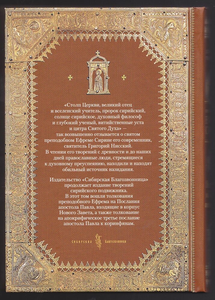 Преподобный Ефрем – необыкновенно плодовитый писатель, число его творений достигало тысячи. Немало потрудился он и в толковании Священного Писания – объяснении Пятикнижия Моисея, куда вошли пять первых Книг Ветхого Завета – Бытие, Исход, Левит, Числа и Второзаконие. Также известно его знаменитое творение «Толкование на Четвероевангелие», в котором сирийский подвижник следовал не одному какому-либо евангелисту, но своду всех четырех Евангелий, сделанному церковным писателем Тацианом во II веке. В даннуюу книгу вошли толкования преподобного Ефрема на Послания апостола Павла, который считается второй по значимости фигурой в Новом Завете после Иисуса Христа, а его Послания занимают почти треть от общего объема Нового Завета. Послания св. апостола Павла имеют великое значение в составе Нового Завета, ибо в них глубоко и всесторонне раскрывается разъяснение истин евангельского учения. А толкования преподобного Ефрема на Послания апостола Павла позволюят не только понять значение этих учений, но и преодолеть трудности их изучения.