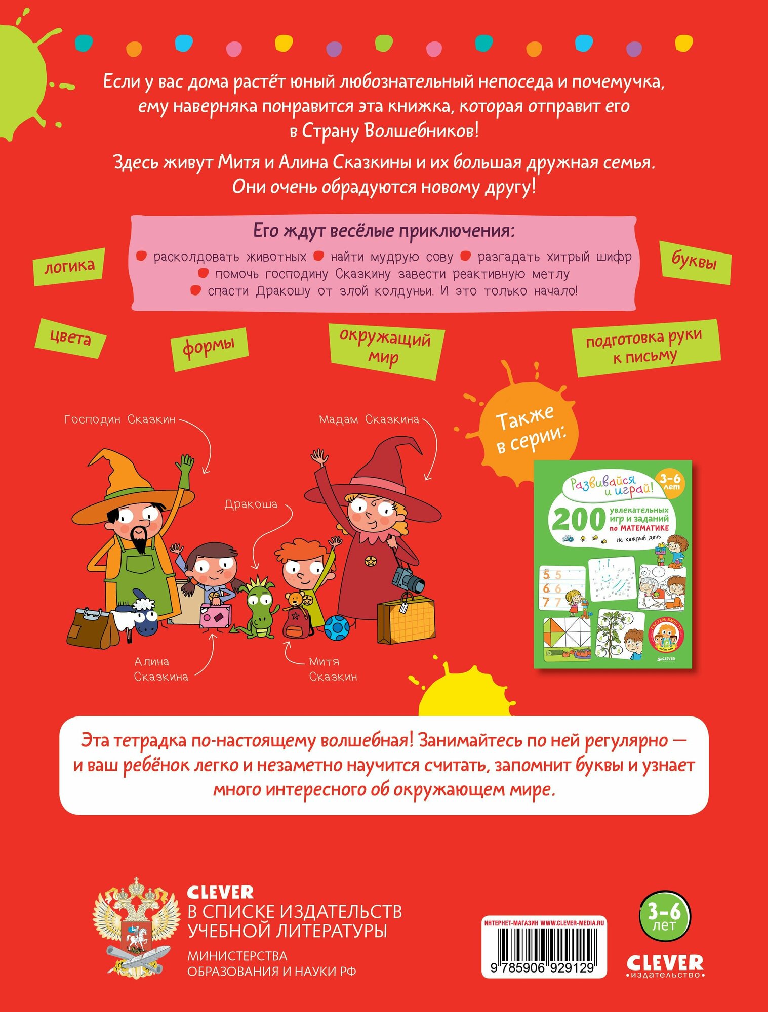 Это даже не тетрадка. Это книга, с которой ребенку не захочется расставаться. Ведь здесь милые персонажи: целое семейство Сказкиных, а также их друзья - Вреднюкина, Пусечкина, Великан и дракончик. Все они будут играть с ребенком, давать ему задания.