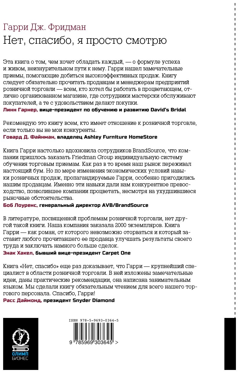 Гарри Фридман - мастер розничной торговли и обучения в этой области. Книга "Нет, спасибо, я просто смотрю" о розничной торговле. Уникальность Г. Фридмана и его книги заключается именно в непревзойденной способности превращать потенциальных покупателей в тех, кто действительно покупает, а также учить этому других. Используя юмор, сопричастность и свой огромный опыт, он рассказывает о том, как достичь вершин мастерства в обслуживании покупателей и стать самым успешным продавцом. Вы узнаете, как преодолеть сопротивление покупателя, как выяснить, что он хочет, как заставить его сделать не только основную, но и дополнительную покупку. Приемы, описанные в этой книге, позволят вам значительно ускорить продвижение по служебной лестнице.