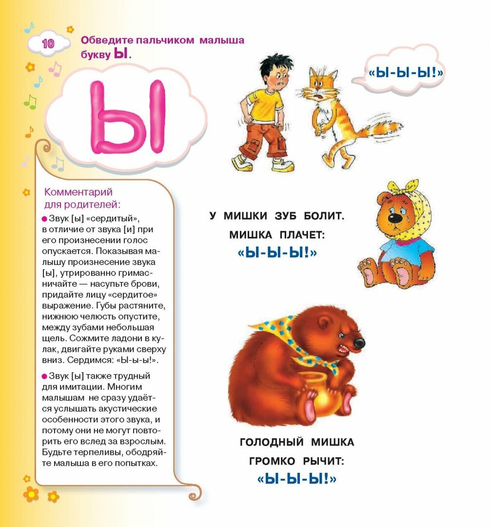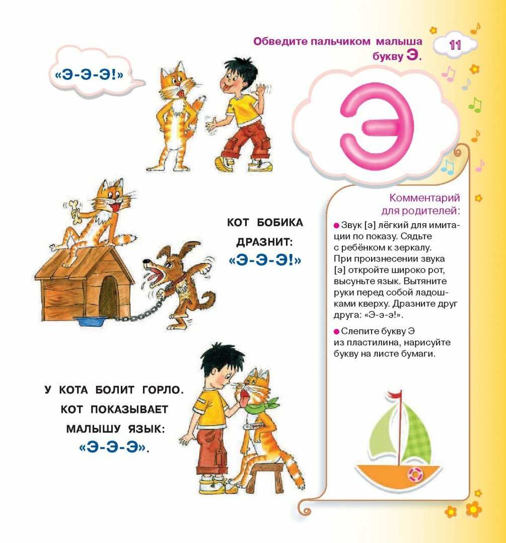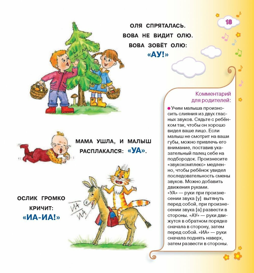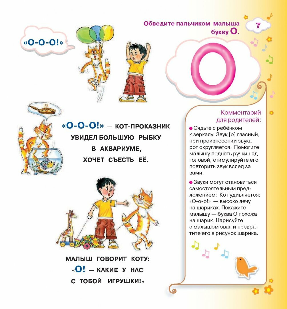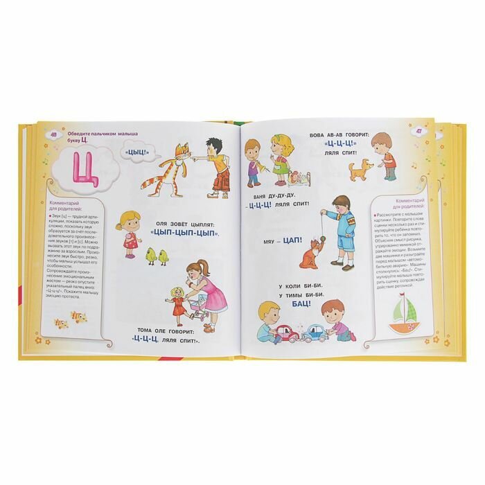 Замечательная книга для занятий с малышом, который пытается произнести первые слова. Красочные, забавные иллюстрации. Есть комментарии в помощь родителям. Разнообразные задания расположены от простого к сложному. Вначале автор в игровой форме знакомит малыша с каждой буквой по отдельности, начиная с гласных. Освоение алфавита происходит с помощью звуков (например тех, что издают животные) и междометий. Далее в книге появляются игровые задания для пополнения словарного запаса ребенка. Идет знакомство с числительными, местоимениями, наиболее распространенными глаголами... И, наконец, малышу предлагается освоить простейшие фразы.