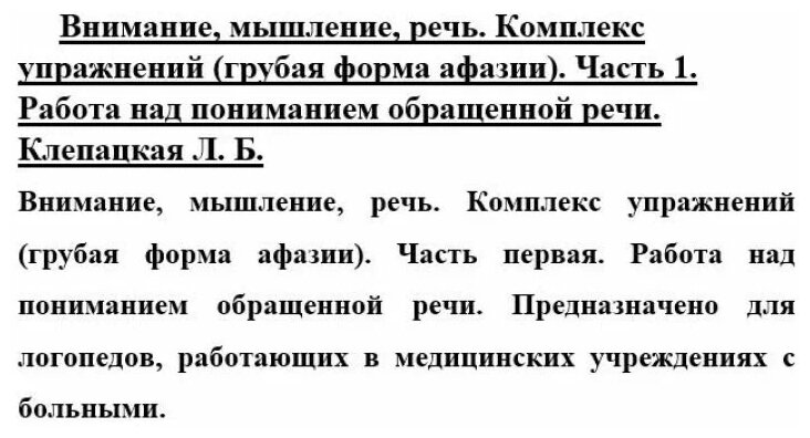 Книга содержит в себе множество упражнений, которые помогают вернуть твёрдую и уверенную речь больному человеку, который, например, пережил инсульт. При систематическом использовании описанных техник и методов можно добиться отличных результатов. В пособии нет воды, только проверенные упражнения. Очень полезный материал как для врачей, так и для личного использования дома.