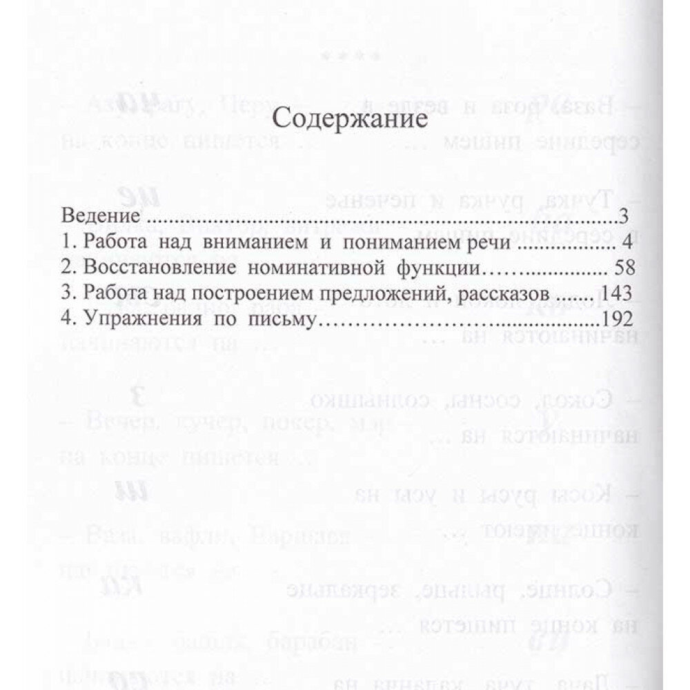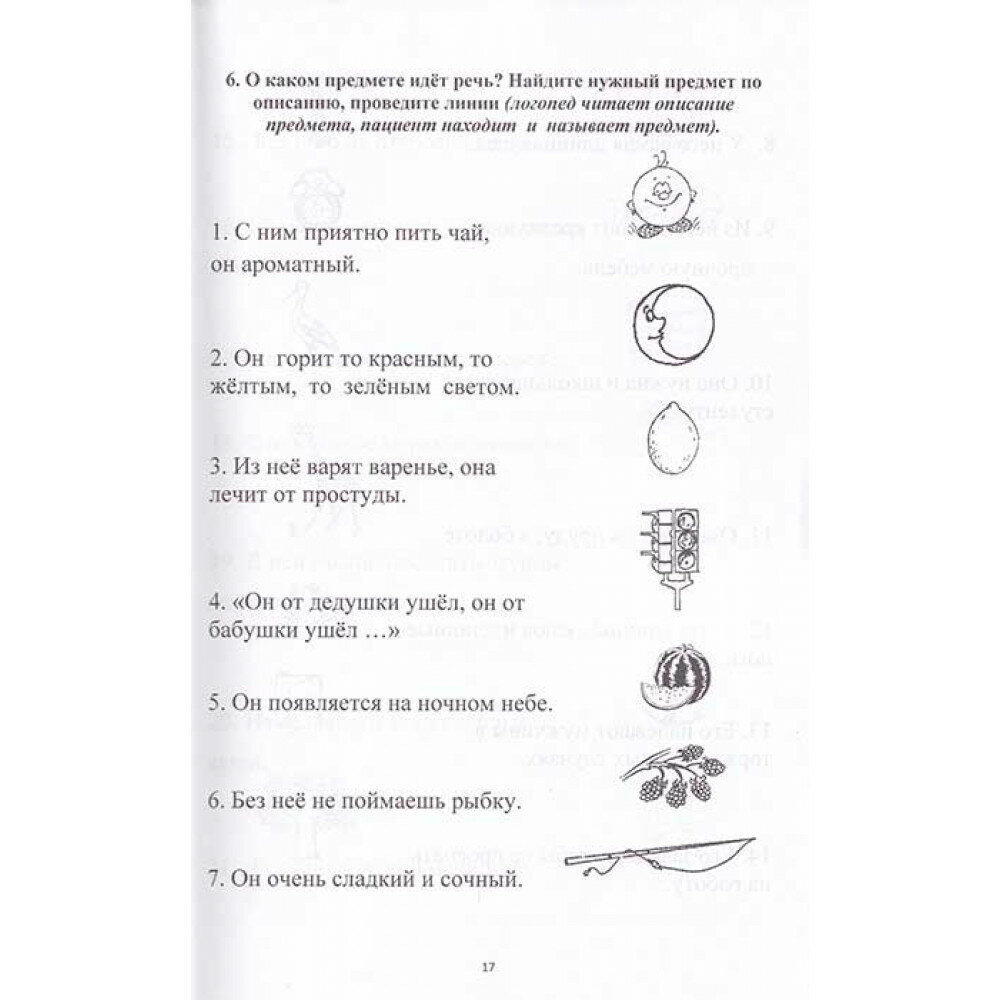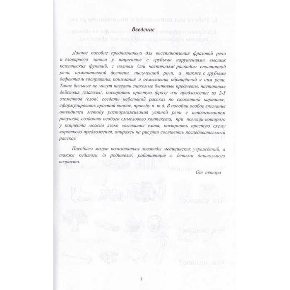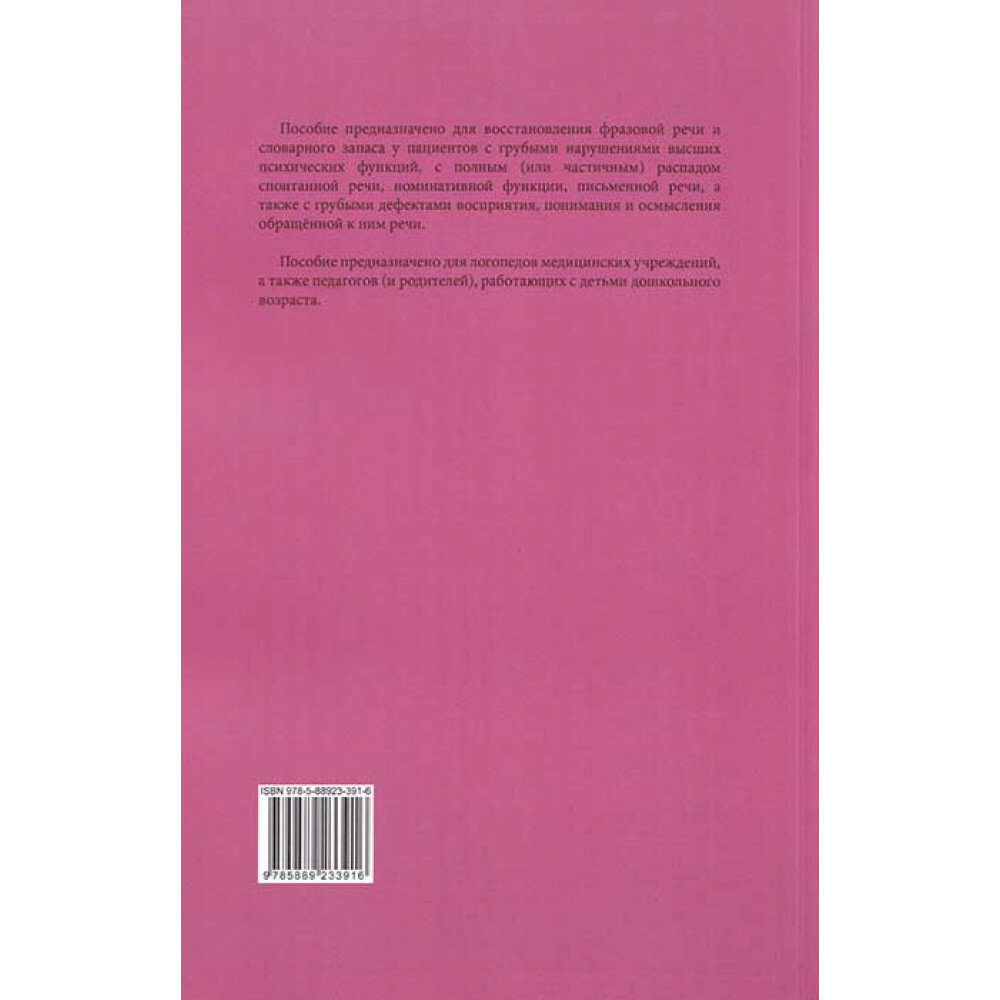 Пособие предназначено для восстановления фразовой речи и словарного запаса у пациентов с грубыми нарушениями высших психических функций, с полным (или частичным) распадом спонтанной речи, а также с грубыми дефектами понимания и осмысления обращенной к ним речи.
