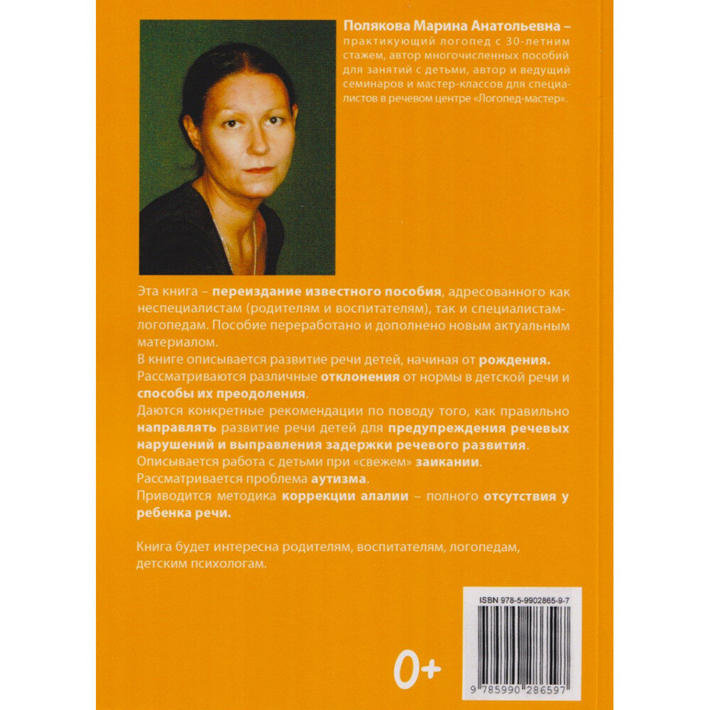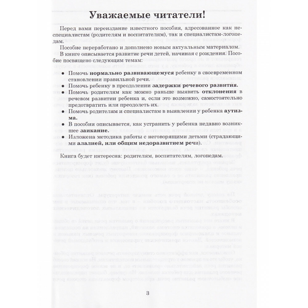 Эта книга - переиздание известного пособия, адресованного как специалистам-логопедам, так и неспециалистам (родителям и воспитателям). Пособие переработано и дополнено новым актуальным материалом. В книге описывается развитие речи детей, начиная от рождения. Рассматриваются различные отклонения от нормы в детской речи и способы их преодоления. Даются конкретные рекомендации по поводу того, как правильно направлять развитие речи детей для предупреждения речевых нарушений и выправления задержки речевого развития. Описывается работа с детьми при "свежем" заикании. Рассматривается проблема аутизма. Приводится методика коррекции алалии - полного отсутствия у ребенка речи.