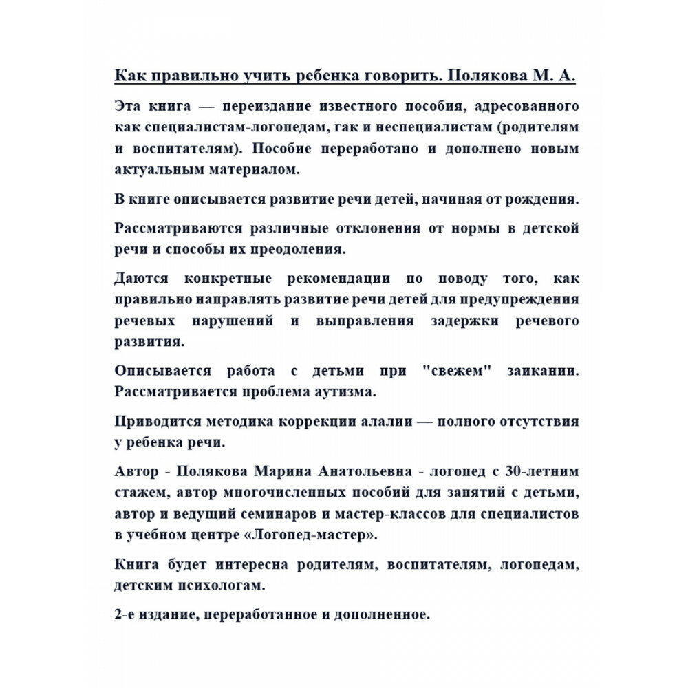 Мне книга очень понравилась! И как маме и как будущему логопеду! Очень простым языком написаны этапы становления речи у ребенка! Прямо все разжевано, много практических заданий что делать чтобы ребенок заговорил. Написано как делать правильно и нужно, и как не нужно! Книга очень полезна будет как обычным родителям так и воспитателям, педагогам, логопедам! Полезна при норме развития речи так и при задержке речевого развития! И что важно помогает разобраться как отличить норму от задерженого развития!!!