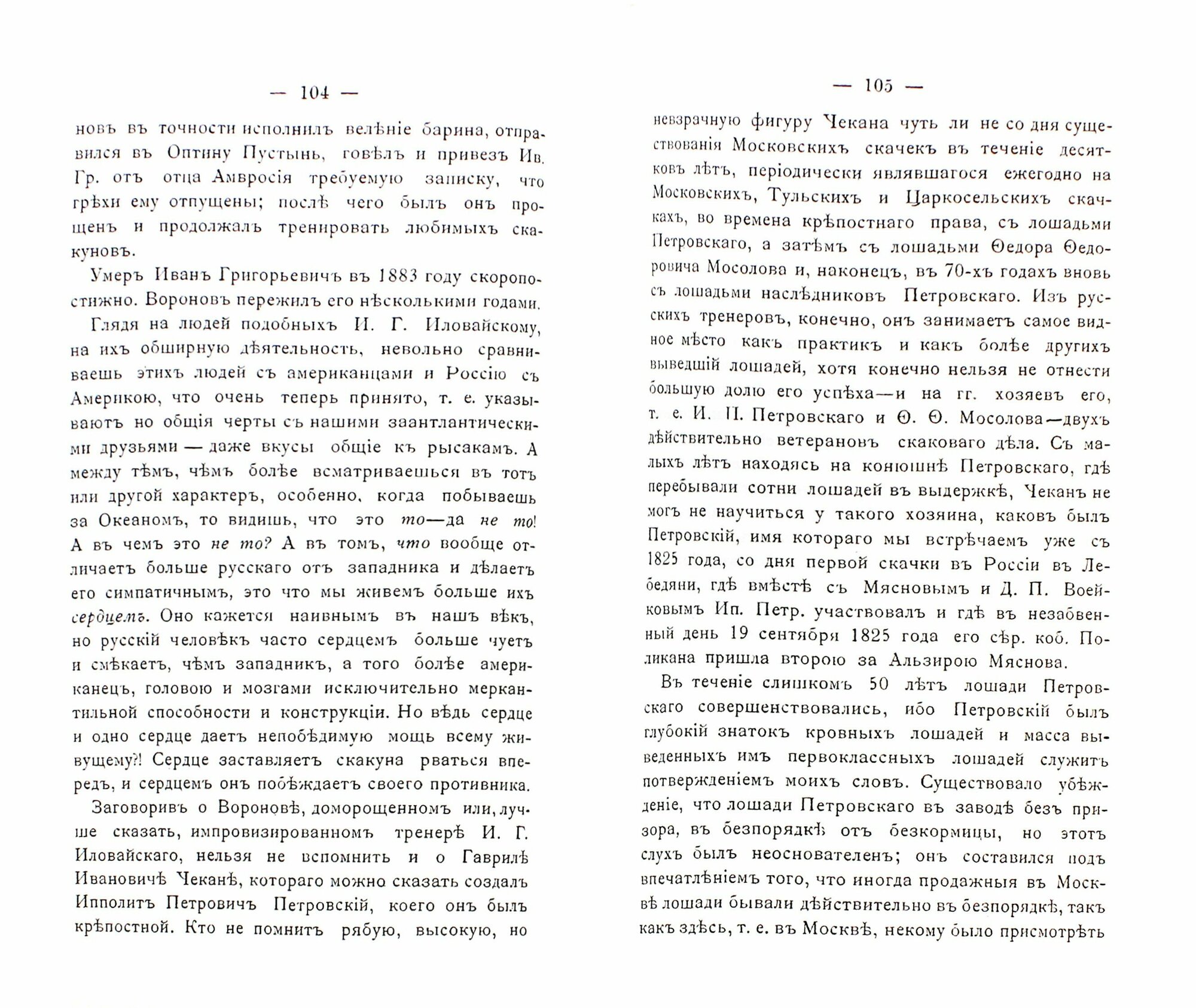 Репринт с издания. Москва, 1890. Книга о встречах с известными псовыми охотниками и любителями лошадей. В книгу добавлены "Наброски из воспоминаний" Оболенского Москва, 1894-1898 гг. Дмитрий Дмитриевич Оболенский (1844-1931) - князь, известный охотник, помещик, коннозаводчик, статский советник (1890), Епифанский и Ефремовский уездный предводитель дворянства (1870-1880), шталмейстер двора Александра II, публицист, мемуарист. Родился в 1844 г. в Москве. Сын князя Д. Н. Оболенского (1820-1884). Мать Елизавета Ивановна (1822-1902), урожденная Бибикова, была давней знакомой Л. Н. Толстого. Выйдя после смерти Д. Н. Оболенского (он был убит своим крепостным) замуж за барона В. М. Менгдена, она осталась дружна с семьей Толстых. Дружеские отношения с Л. Н. Толстым поддерживал и Д. Д. Оболенский, нередко встречаясь с ним на охоте. Толстой в 1870-е гг. довольно часто бывал в имении Оболенского Шаховское Богородицкого уезда Тульской губернии, приезжая туда поохотиться. Шаховское в этот период служило для охотников сборным пунктом. Заядлый охотник Оболенский неоднократно избирался вице-президентом Императорского Скакового общества и Тульского рысистого общества, был редактором газеты "Охота и спорт". В 1923 г. эмигрировал во Францию. Умер в Ницце в 1931 году. На страницах журнала "Русский архив" были опубликованы "Наброски из воспоминаний" Оболенского (1894, кн. 3; 1895, № 1, 1898, № 2). Мемуары Оболенского, опубликованные в журнале "Русский архив", начинаются с момента его поступления на юридический факультет Московского университета в 1861 г. Университетские занятия он совмещал с написанием уставных грамот крестьянам в трех имениях: Богородицкого, Ефремовского и Веневского уездов, под руководством попечителя, князя В. А. Черкасского. В эти годы Оболенский уже занимал должность председателя земского собрания в Ефремове. В "Воспоминаниях" в "Русском архиве" подробно описываются первые годы службы в Ефремовском у. (1868-1869), связанные с голодом и неурожаем. Большое место в мемуарах занимает его участие в создании Ряжско-Вяземской железной дороги. В 70-х гг. Оболенский поселился в Туле. В декабре 1870 г. его избрали предводителем дворянства Ефремовского уезда.
