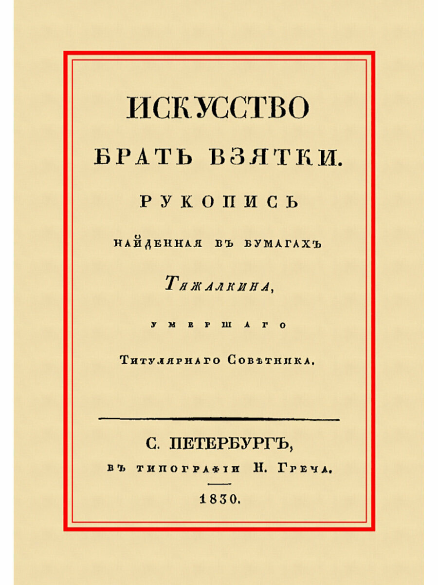 Рукопись, найденная в бумагах Тяжалкина, умершего Титулярного Советника. Лекции на эту тему. Стародавний юмор. Эраст Петрович Перцов (1804-1873) - разносторонний литератор, писатель, поэт, автор комедий и теоретических исследований в области политики, экономики, сельского хозяйства и прикладной науки. Публиковался в журналах "Отечественные записки", "Северная пчела", "Библиотека для чтения". В 1847-1854 гг. являлся редактором "Журнала общеполезных сведений". В сатирическом произведении "Искусство брать взятки" (1830 г.) автор иронизировал над тем, что "при нынешних решительных мерах правительства искусство брать взятки начинает приходить в упадок", и поэтому торопил читателя воспользоваться советами чиновника, изложенными от первого лица в виде лекций. В книге описаны виды взяток, приводятся напутствия о том, как избежать ответственности и как можно манипулировать просителем.