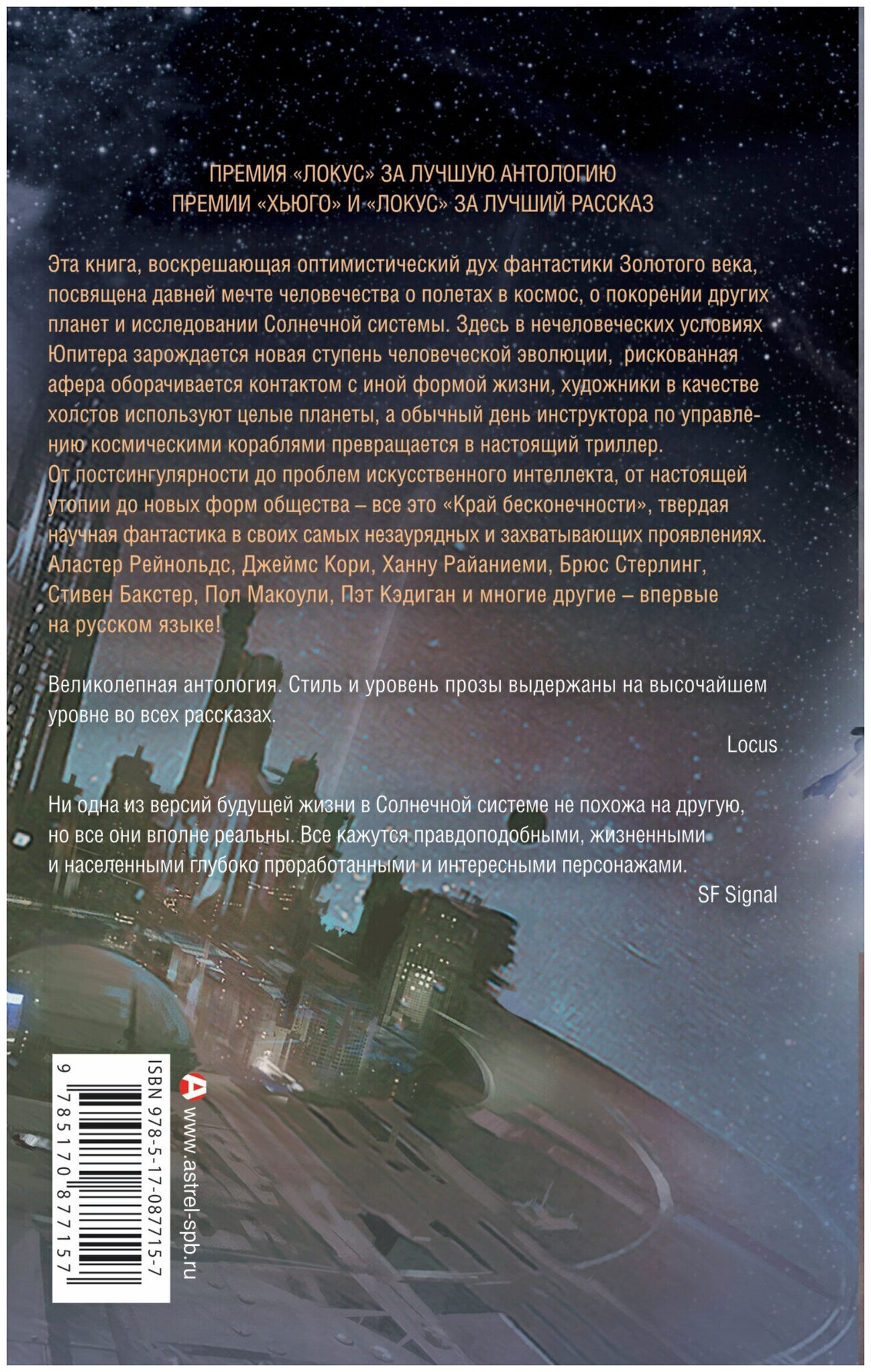 Эта книга, воскрешающая оптимистический дух фантастики Золотого века, посвящена давней мечте человечества о полетах в космос, о покорении других планет и исследовании Солнечной системы. Здесь в нечеловеческих условиях Юпитера зарождается новая ступень человеческой эволюции, рискованная афера оборачивается контактом с иной формой жизни, художники в качестве холстов используют целые планеты, а обычный день инструктора по управлению космическими кораблями превращается в настоящий триллер. От постсингулярности до проблем искусственного интеллекта, от настоящей утопии до новых форм общества - все это "Край бесконечности", твердая научная фантастика в своих самых не заурядных и захватывающих проявлениях. Аластер Рейнольдс, Джеймс Кори, Ханну Райаниеми, Брюс Стерлинг, Стивен Бакстер, Пол Макоули, Пэт Кэдиган и многие другие - впервые на русском языке!
