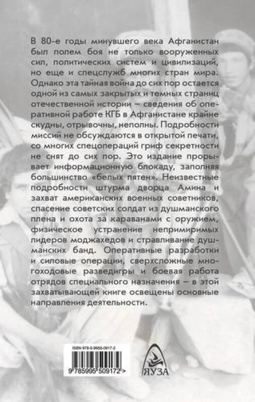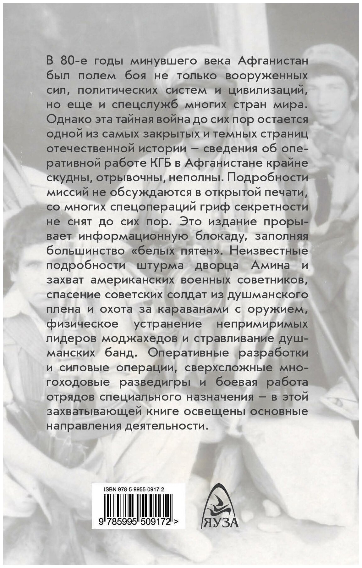 В 80-е годы минувшего века Афганистан был полем боя не только вооруженных сил, политических систем и цивилизаций, но еще и спецслужб многих стран мира. Однако эта тайная война до сих пор остается одной из самых закрытых и темных страниц отечественной истории - сведения об оперативной работе КГБ в Афганистане крайне скудны, отрывочны, неполны. Подробности миссий не обсуждаются в открытой печати, со многих спецопераций гриф секретности не снят до сих пор. Это издание прорывает информационную блокаду, заполняя большинство "белых пятен". Неизвестные подробности штурма дворца Амина и захват американских военных советников, спасение советских солдат из душманского плена и охота за караванами с оружием, физическое устранение непримиримых лидеров моджахедов и стравливание душманских банд. Оперативные разработки и силовые операции, сверхсложные многоходовые разведигры и боевая работа отрядов специального назначения - в этой захватывающей книге освещены основные направления деятельности.