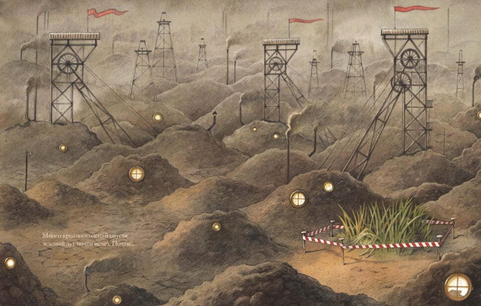 Теперь о самой книге: история технологического прогресса и ухудшении экологии показана на примере цивилизации кротов, рассказ подан в форме графического романа, слов практически нет, да они и не нужны, все понятно и так. Иллюстрации отличные, только вот после историй о мышатах, я ожидала что этот рассказ будет подлиннее, но он очень уж короткий, за минуту можно посмотреть книгу, если конечно не рассматривать подробно, а это делать надо обязательно, очень уж хороши рисунки :-)
