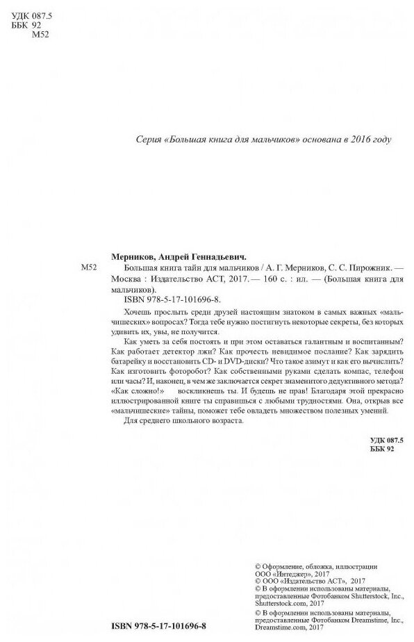 Сервис сравнения цен СкидкаГИД предлагает сравнить цены на товар «Книга: Большая книга тайн для мальчиков (Мерников Андрей Геннадьевич, Пирожник Светлана Сергеевна); ООО "Издательство Астрель", 2020»