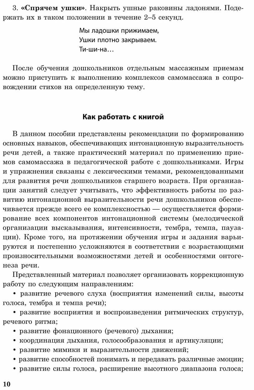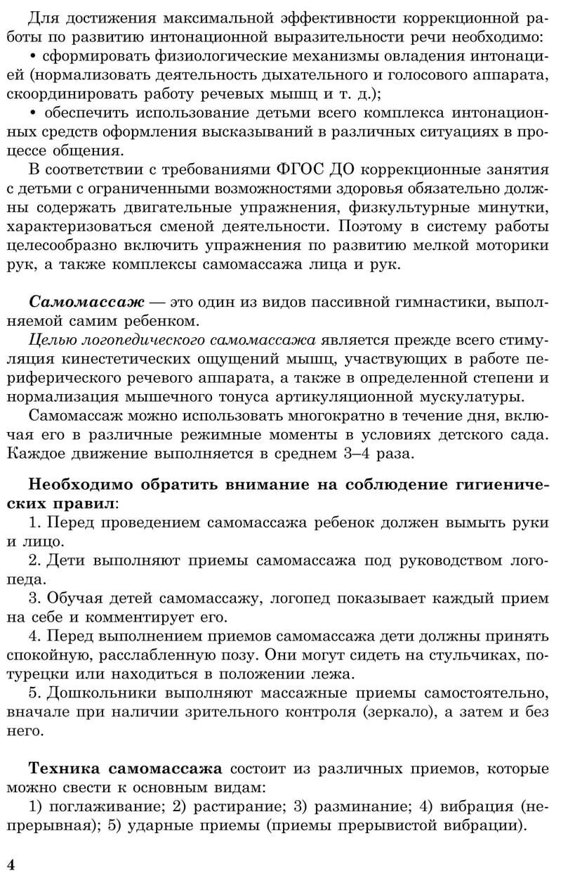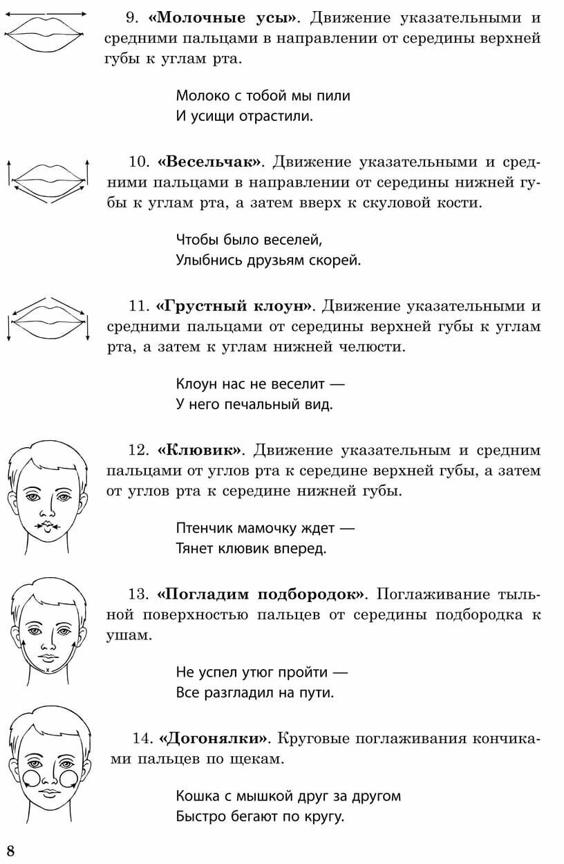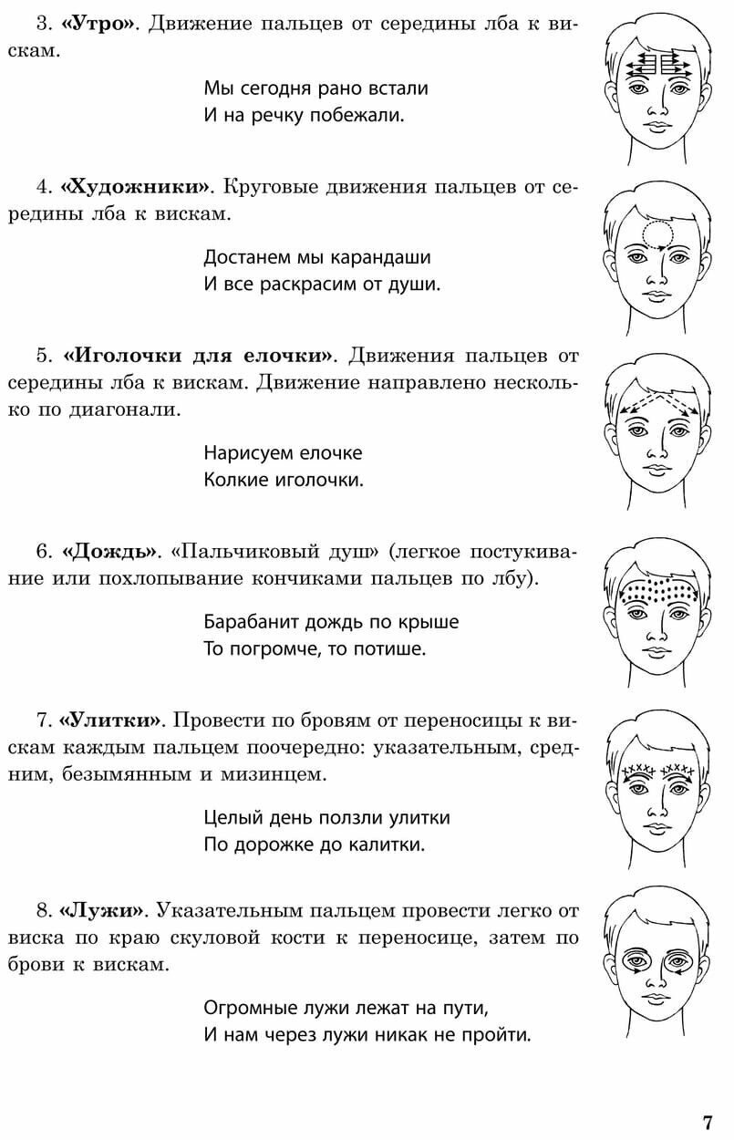 С целью повышения двигательной активности детей авторы включили в систему работы комплексы самомассажа лица и рук на основе авторских текстов. Подробное описание техники самомассажа и картинки помогут взрослому понять и освоить методику работы.