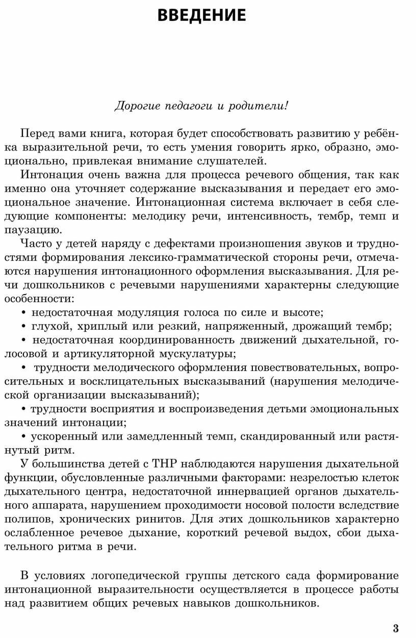 Игры и упражнения соотнесены с 30 лексическими темами, изучаемыми в детском саду. В играх, при чтении стихотворений наизусть, при произнесении пословиц и отдельных предложений ребенок учится с помощью интонации выражать различные эмоции. Прослушивание текстов, ответы на вопросы и выполнение других заданий способствуют развитию умения малыша понимать эмоциональное состояние героя или рассказчика, расширению активного словаря дошкольника, развитию у него слухоречевой памяти, внимания и мышления. Пластические этюды, задания, связанные с перевоплощением (драматизацией), помогают раскрытию творческих способностей ребенка.