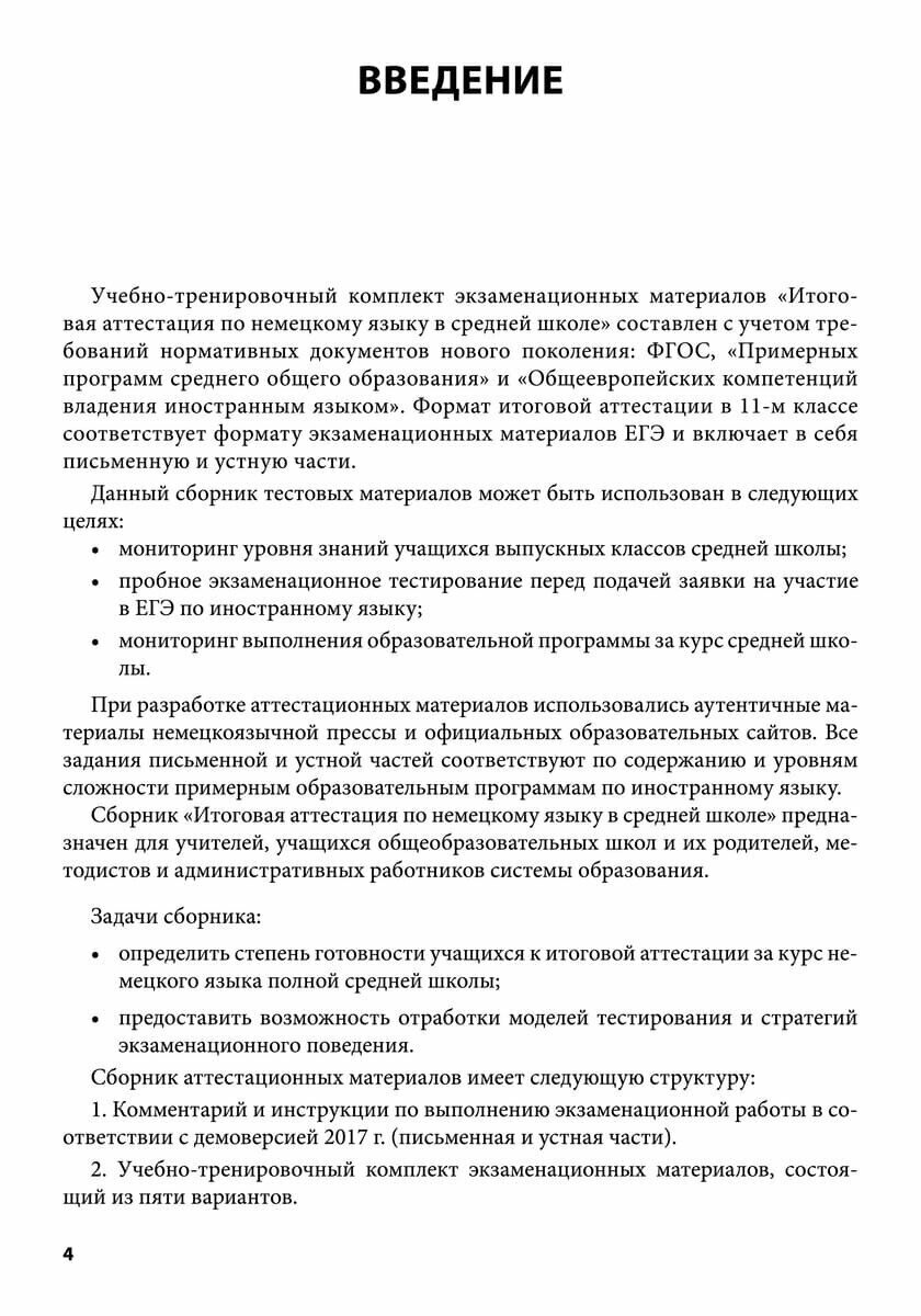 Учебно-тренировочный комплект экзаменационных материалов "Итоговая аттестация по немецкому языку в средней школе" включает в себя пять вариантов тестовых заданий в формате ЕГЭ. Все задания письменной и устной частей по содержанию и уровням сложности соответствуют примерным образовательным программам по иностранному языку. Сборник предназначен для учителей, учащихся общеобразовательных школ и их родителей, методистов и административных работников системы образования. Материалы сборника могут быть использованы для проведения мониторинга обученности и пробного экзаменационного тестирования.