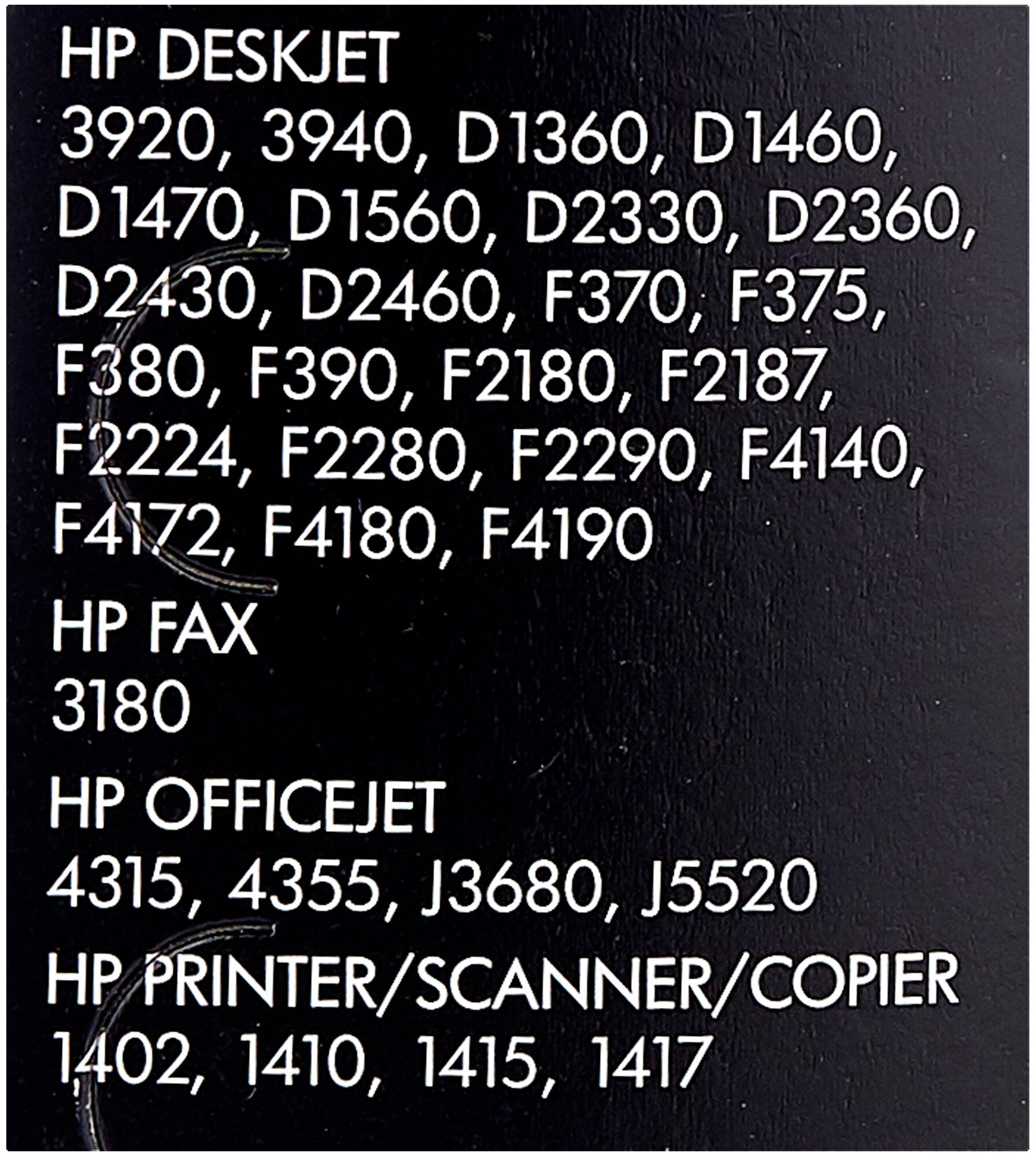 | Совместимые модели | Deskjet 3910, 3920, 3930, 3940, D1311, D1320, D1330, D1341, D1360, D1420, D1430, D1445, D1455, D1460, D1468, D1520, D1530, D1560, D2330, D2345, D2360, D2430, D2445, D2460, D2468, F2110, F2120, F2140, F2180, F2185, F2187, F2210, F2212, F2235, F2240, F2250, F2275, F2280, F2290, F325, F335, F340, F350, F370, F375, F380, F390, F394, F4135, F4140, F4150, F4172, F4175, F4180, F4185, F4190, F4194 |