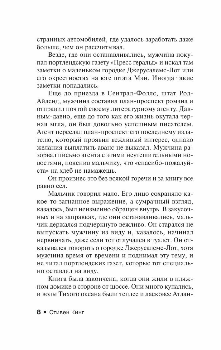 Невероятно атмосферная, пропитанная готическим духом история, в которой переплетаются аллюзии на некоторые классические произведения американских авторов. Прочитав пролог, я ничего не понял, не понял, что за история меня ждет, не понял, вообще, как история будет развиваться. Но после первых нескольких глав постепенно осознание и понимание наступает. В некоторых книгах Стивена Кинга история начинается резко, прям на месте, не успеешь прочитать первые 100 страниц. В "Жребии" же все немного иначе - сюжетные линии, помимо основной линии Бена Миерса, незаметно друг с другом переплетаются, интриги и сплетни Салемс-Лота прикрыты дружественной ширмой, за которой скрывается... да много чего скрывается. Не только измены, предательства и мерзости, но и то, о чем лучше не говорить. Мне книга очень понравилась! Недооценивать ее не стоит ни в коем случае, и, думаю это всем известно, это одна из первых книг Кинга. Как и многие ставшие уже культовыми книги Стивена, "Жребий" довольно плавен в плане истории, саспенса. Сравнивая с "Сиянием" можно найти кое-что общее - медленное нарастание ужаса, который скрыт где-то внутри (в "Сиянии" этим ужасом является отель, а в "Жребии" Марстен-Хаус). Подытоживая, можно сказать, что книга должна быть в разделе "маст-рид", особенно если вы только начали читать Кинга.