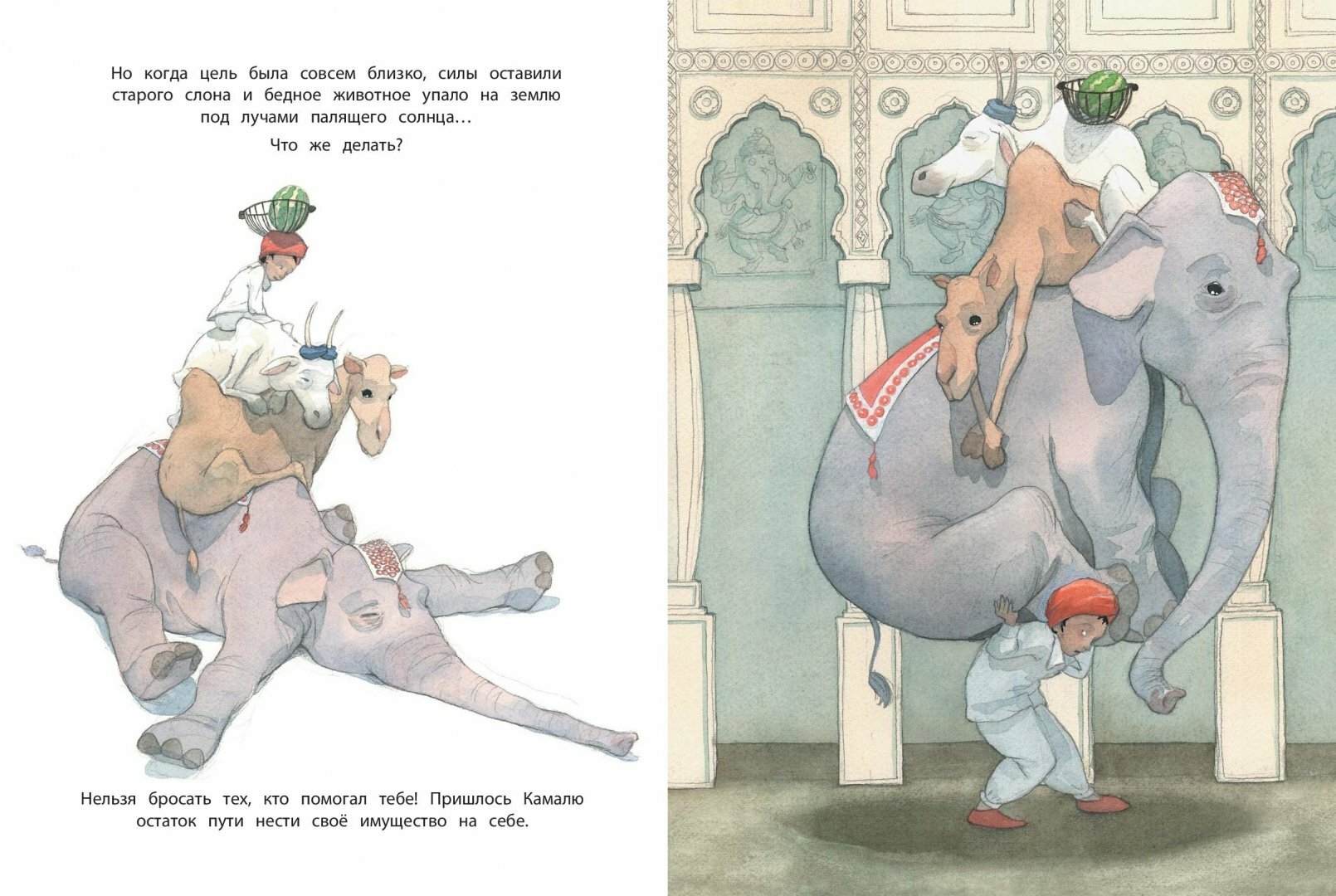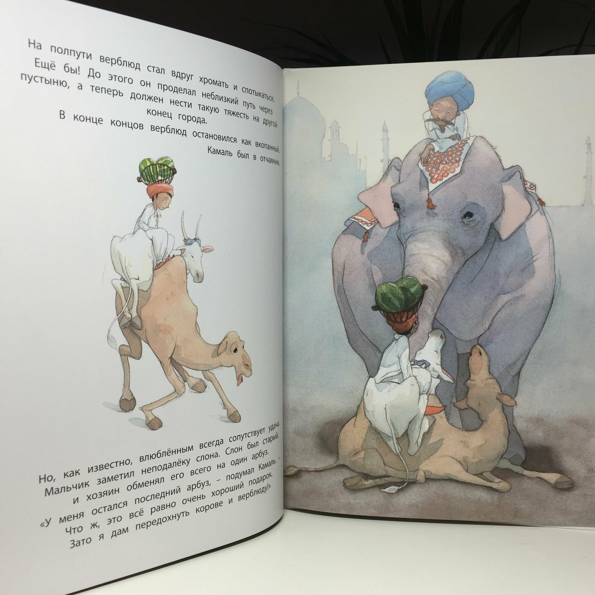 Мальчик Камаль уложил в корзину несколько сочных арбузов, отправился в гости к Лейле. Путь был неблизким, а солнце нещадно палило. Устав, мальчик обменял пару арбузов на корову, надеясь, что она отвезет его на другой конец города. Но корова тоже быстро лишилась сил. Тогда Камаль выменял на арбузы верблюда, потом слона. Но и они падали от усталости и жары. Чтобы утолить жажду, им пришлось съесть последний арбуз…