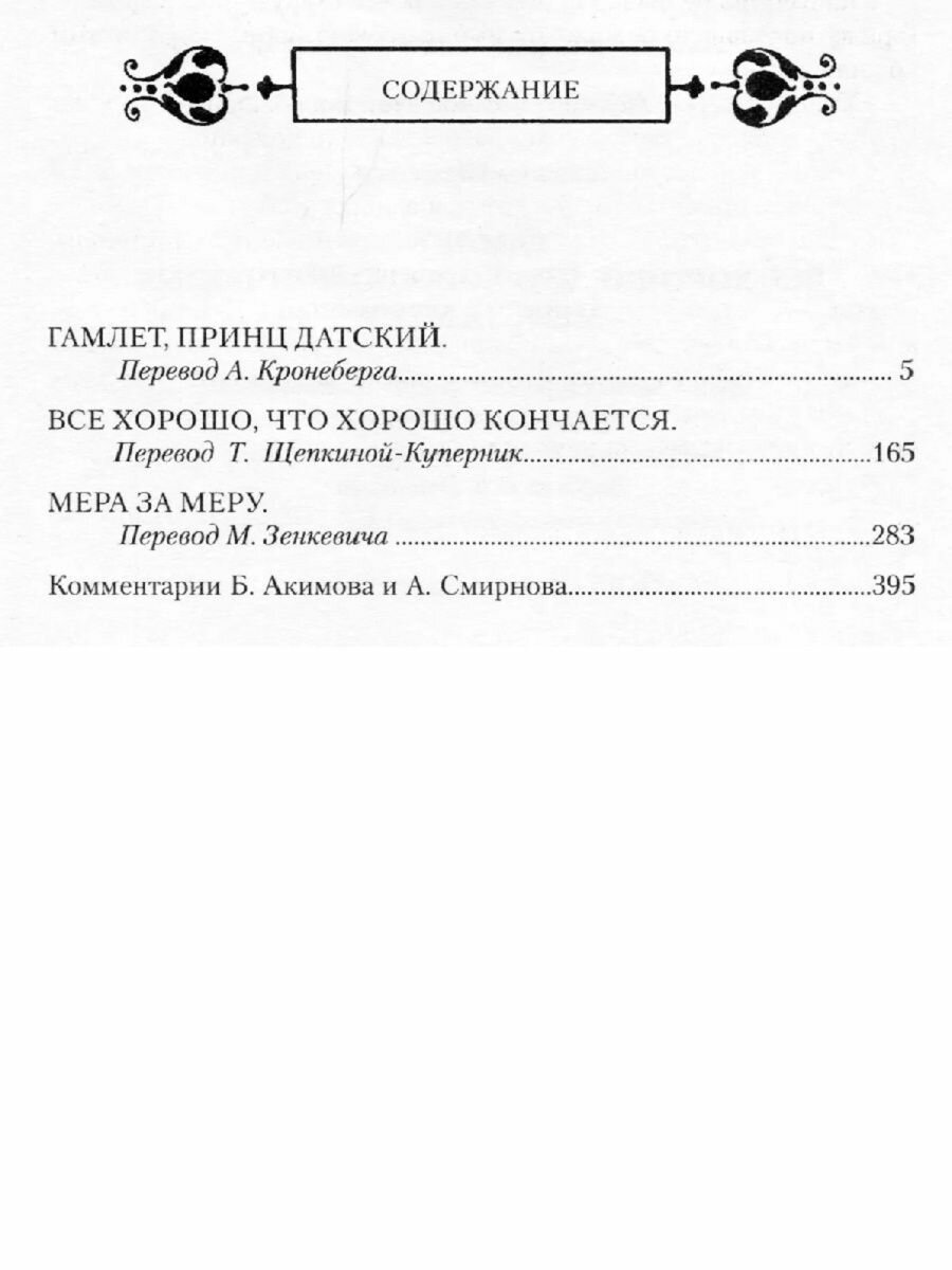 В данный том собрания сочинений Шекспира вошла трагедия "Гамлет", а также пьесы "Все хорошо, что хорошо кончается" и "Мера за меру", относящиеся к разряду так называемых мрачных комедий.