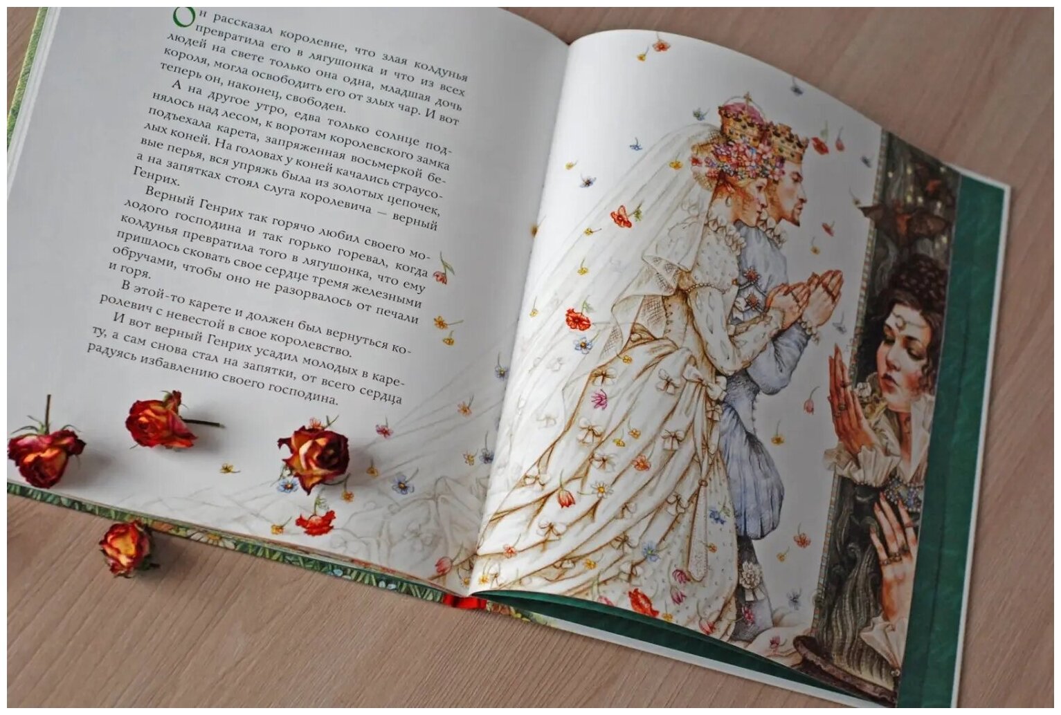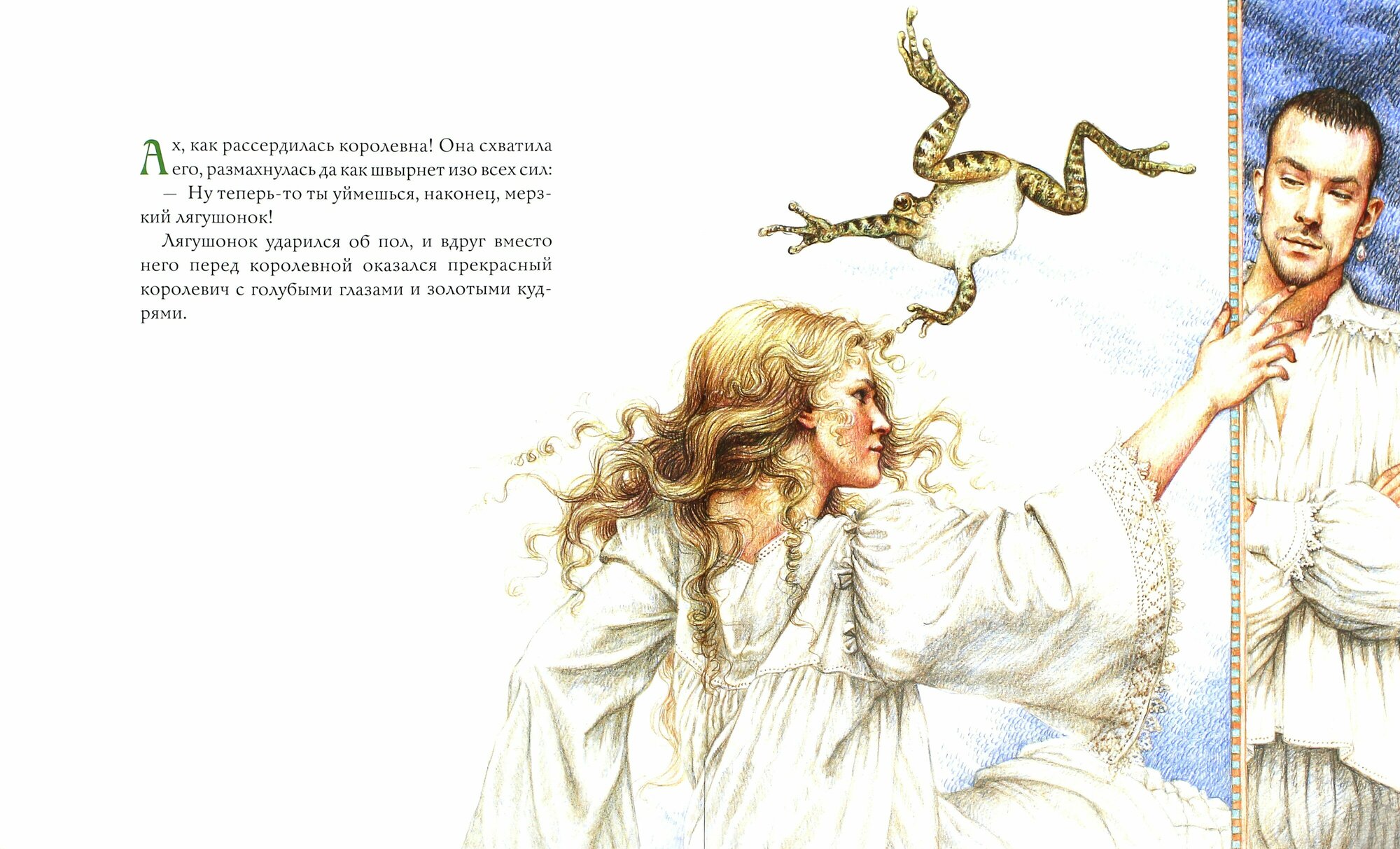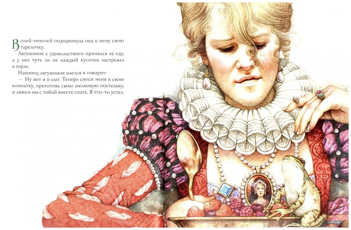 Говорят: " на вкус и цвет - товарищей нет". Сколько людей - столько и мнений. Но всё же, мне кажется, художник иллюстратор обязан читать произведение с которым работает. И если написано, что лягушонок превратился в прекрасного принца с золотыми кудрями, то это и должно быть нарисовано. По факту - почти под ноль стриженный мачо с тяжёлым взглядом. Неувязочка. Как объяснить это ребёнку особенно если текст и иллюстрация на одной странице? Редактора, ау!