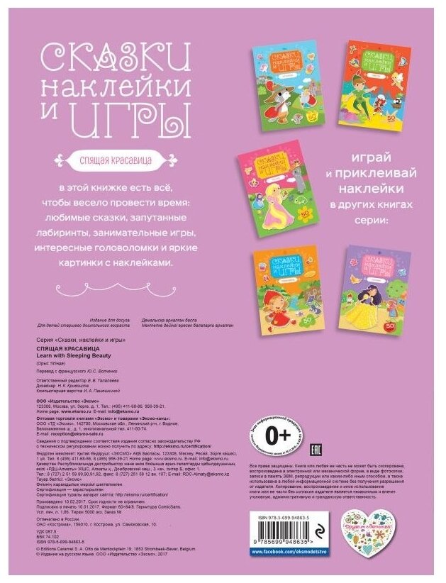 Замечательная серия «Сказки, наклейки и игры» (6 книг) предназначена для занятий с детьми начиная с 4-х лет. Читая сказки, выполняя задания и приклеивая наклейки, малыши не только смогут улучшить интеллектуальные способности, но весело и с пользой провести свое время. Занимаясь по нашим книгам, ребенок научится быть внимательным и наблюдательным, разовьет память, логическое мышление, мелкую моторику и речь. Наклейки в книгах специально предназначены для маленьких ручек: они не имеют острых углов и мелких деталей. Дети не будут испытывать трудности с их приклеиванием.