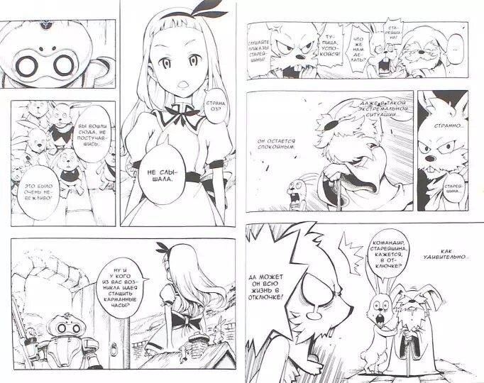 Очень странная история: Алиса, кролики, роботы, появляется даже Дороти из страны Оз. Сюжет быстро развивается и неожиданно заканчивается. И почти всё время происходят сражения и драки. Комикс кстати 16+, ничего страшного, просто гигантская девочка с бензопилой отрубает роботам руки ) Честно говоря я мало что понял, слишком стремительно.