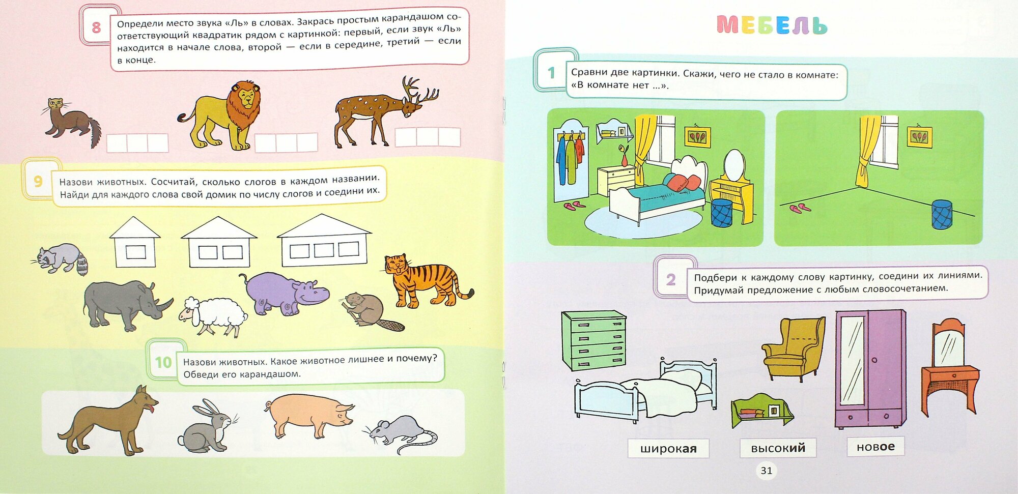 Предложенные в ней игры и упражнения помогут также в обогащении и активизации словаря, расширении кругозора и формировании понятий (времена года, фрукты, овощи, одежда, обувь, животные, профессии и др.), закреплении знаний о звуках и буквах.