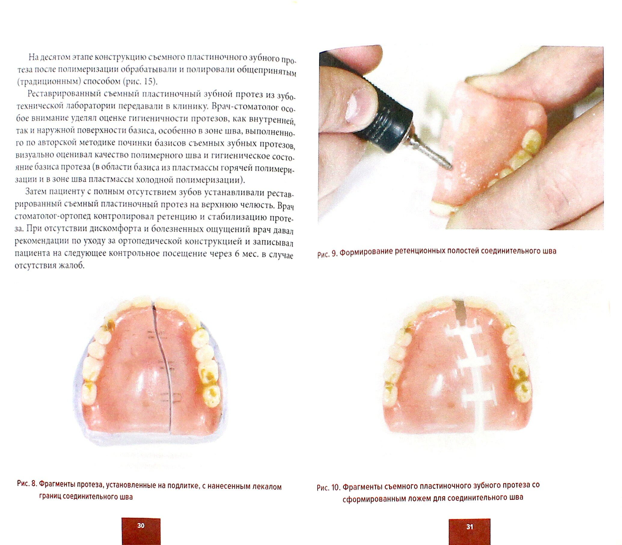 Клиническими наблюдениями продемонстрирована достаточная прочность и надежность соединительного шва починки базисов, осуществленной по предложенному способу, что важно, т. к. традиционные конструкции съемных пластиночных зубных протезов недостаточно прочные.