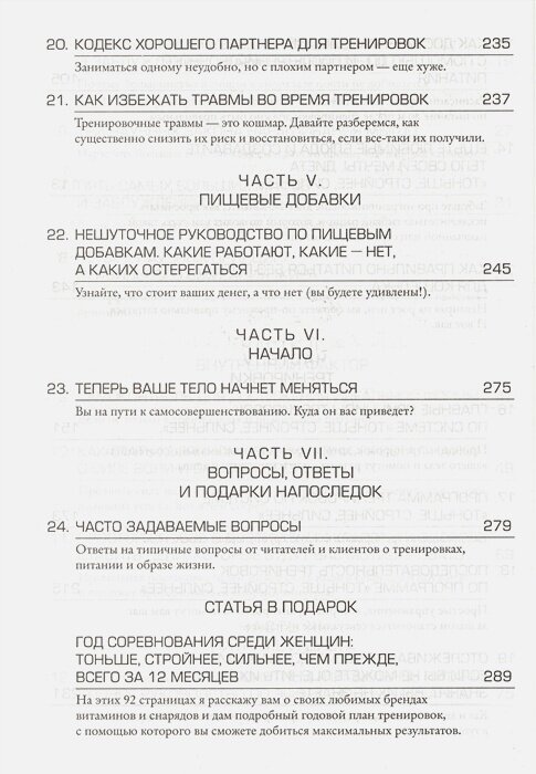 Тем не менее это далеко не самая плохая книга для начинающего спортсмена, в ней доступным языком изложены работающие принципы построения тела, выбора диеты и действенные системы упражнений. Если вы сможете вычленить главное в море мироощущения автора, она будет вам полезна. -