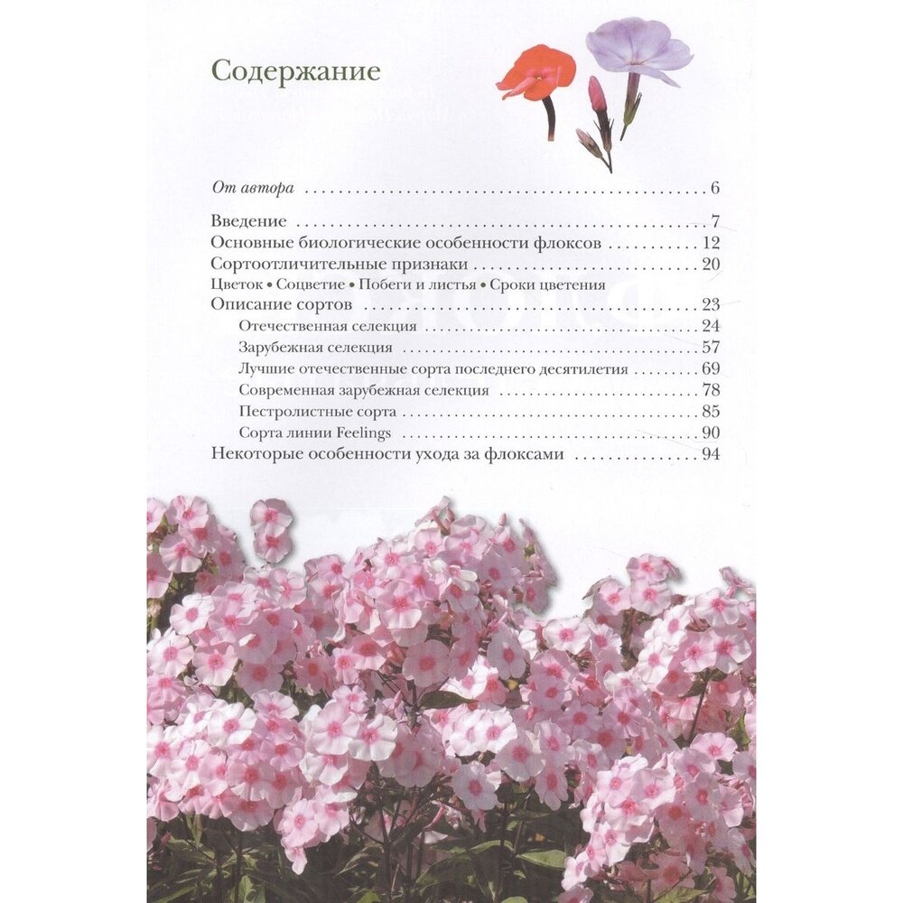 Автор книги И. В. Матвеев - куратор коллекции флоксов Ботанического сада Биологического факультета МГУ им. М.В. Ломоносова - представляет классический ассортимент сортов, а также новинки отечественной и зарубежной селекции. Уделено внимание сортам, меняющим свой цвет на рассвете и в сумерках, пестролистным флоксам и оригинальной линии Feelings.