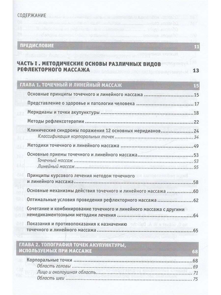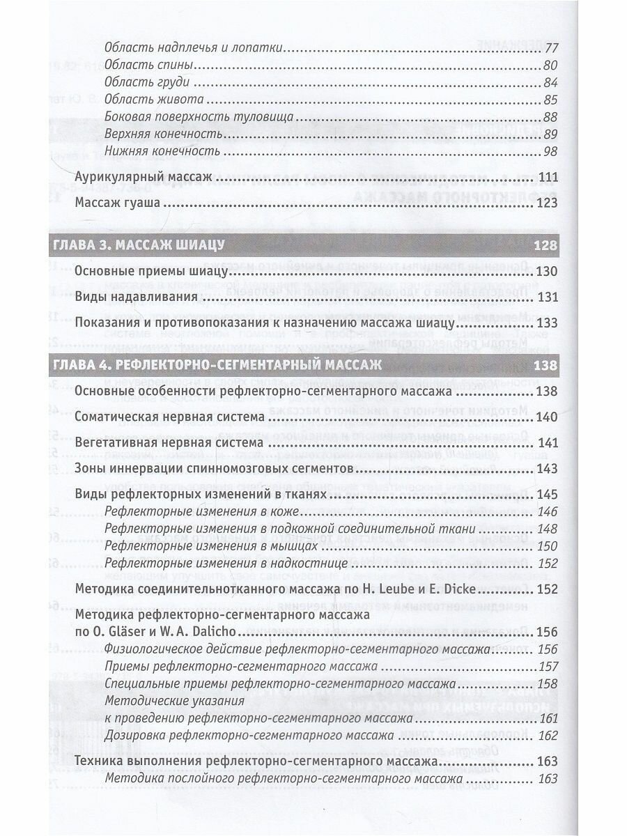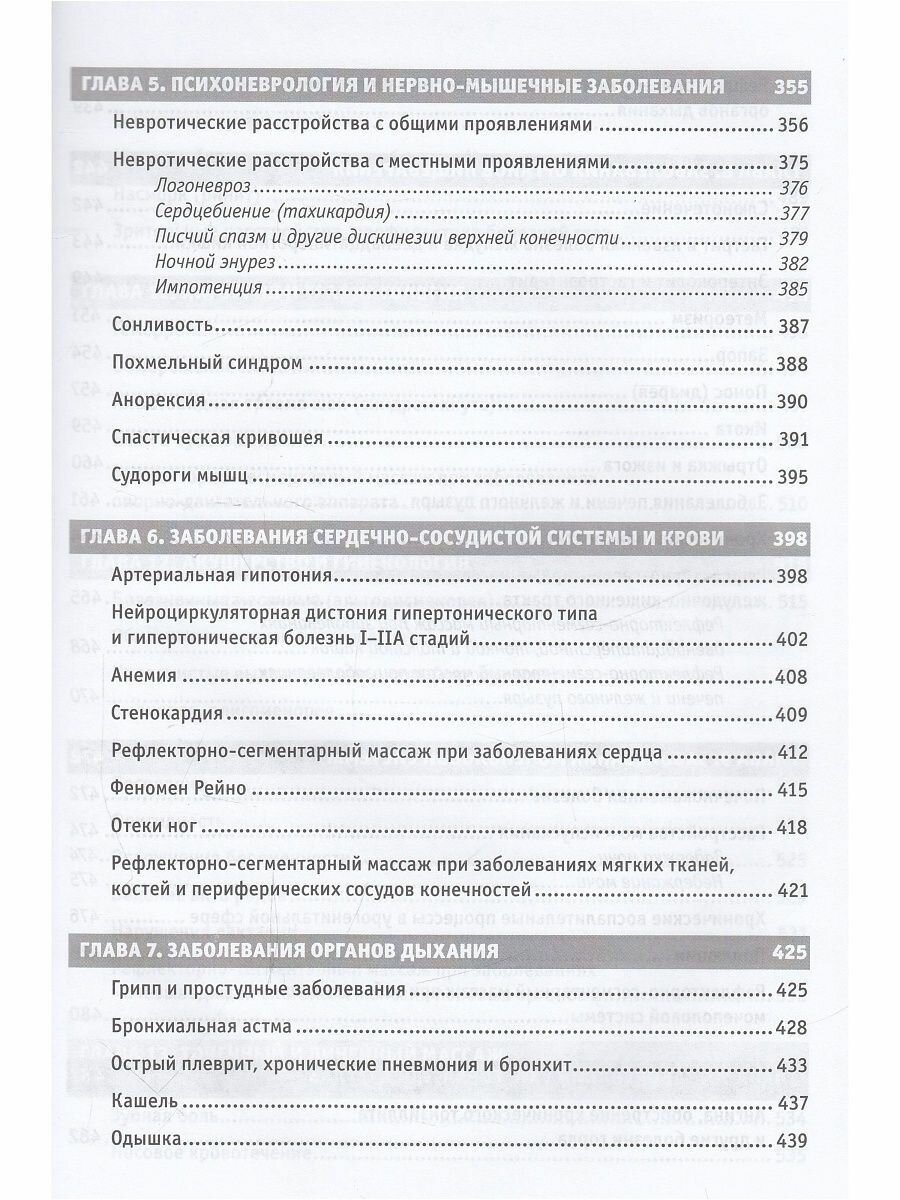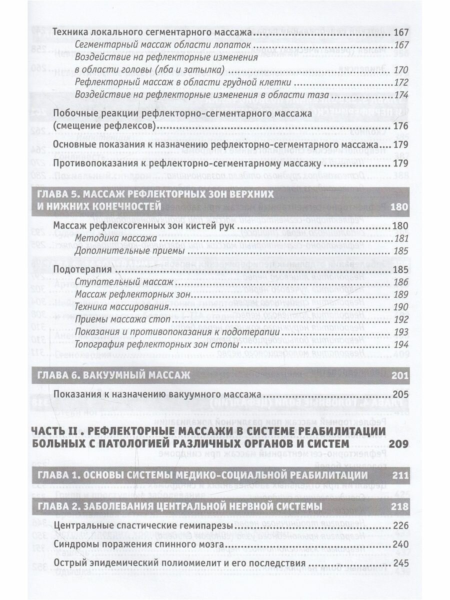Книга посвящена описанию применения различных видов рефлекторного массажа в клинической медицине и реабилитации пациентов с патологией центральной и периферической нервной системы, внутренних органов и кожи, при хирургических и гинекологических заболеваниях, в косметологии, системе неотложной помощи и в профилактической медицине. Также приводятся рекомендации по использованию рефлекторных массажей для общего оздоровления, преодоления стрессовых ситуаций, тревоги и неуверенности в своих силах, стимулирования умственной деятельности человека и восстановления его работоспособности. Впервые в настоящем издании рассмотрены методики всех основных видов рефлекторных массажей: точечного, линейного, зонального ушных раковин, кистей и стоп, рефлекторно-сегментарного, шиацу, гуаша и вакуумного. Книга иллюстрирована 17 таблицами и 89 рисунками и для удобства пользования снабжена обширным тематическим указателем. Книга предназначена для массажистов, инструкторов ЛФК, врачей клинических специальностей, специалистов по медицинской реабилитации, косметологов, диетологов и средних медработников. Отдельные ее разделы будут полезны читателям без специального медицинского образования, желающим улучшить свое самочувствие и внешний вид путем самомассажа, дозированной гимнастики и оптимизации диеты. Полное описание