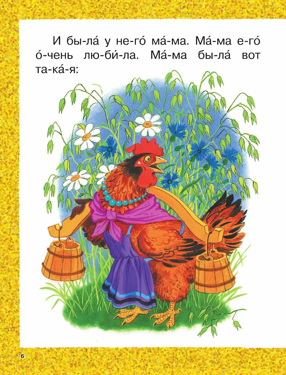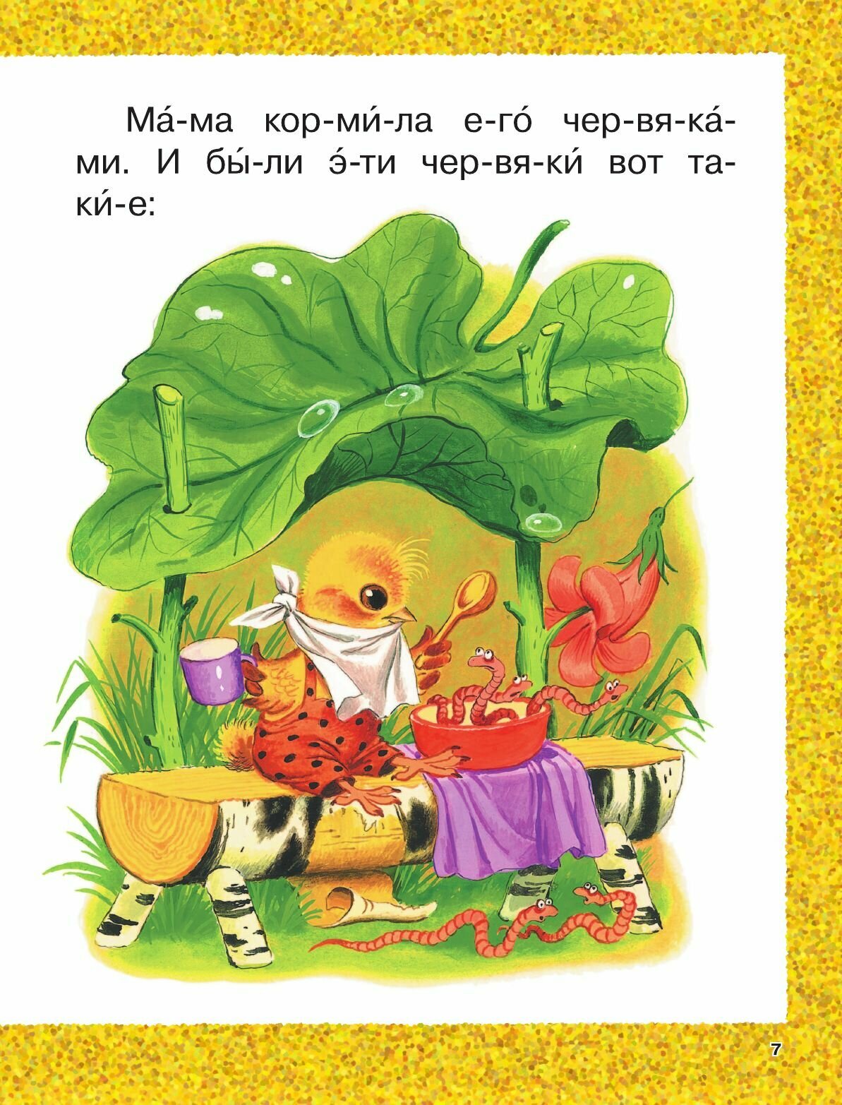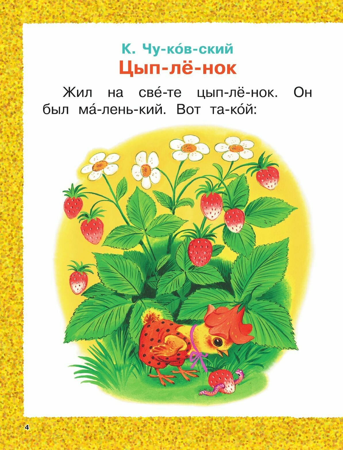 Начинали читать с этой книги. Дочке понравилось. Красочные иллюстрации на каждой странице. Очень крупный шрифт (редко такой встречала), мало текста на странице. Про цыпленка очень понравилось и "Сказка о глупом мышонке". По слогам дочь читала месяца 2, поэтому книгу теперь не используем. Считаю, что это единственный минус книги. При этом на момент, когда читала по слогам, не была способна прочитать больше двух строк.