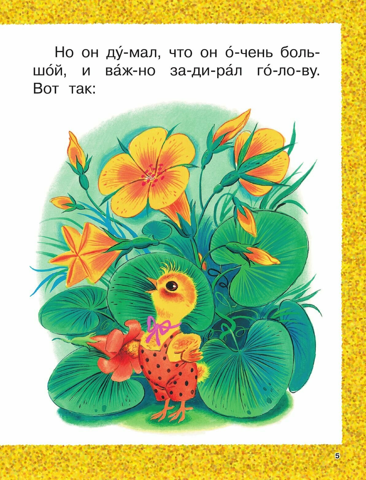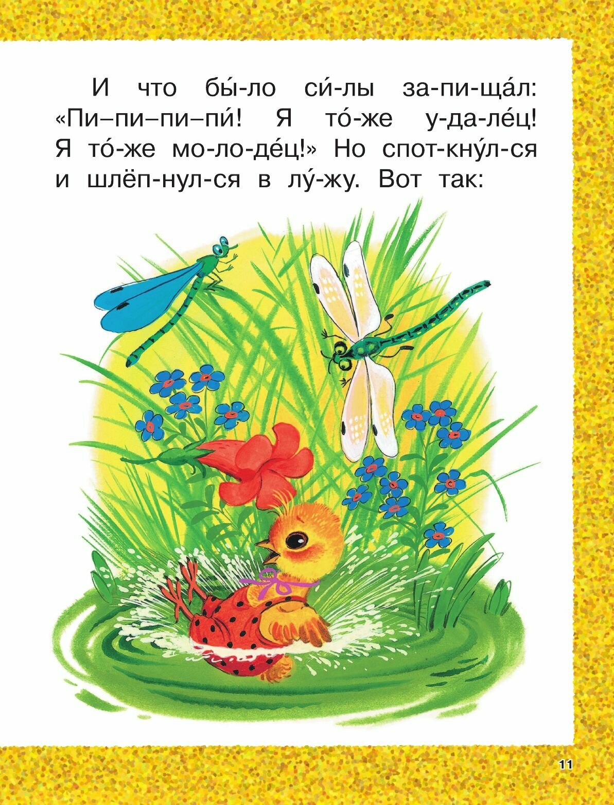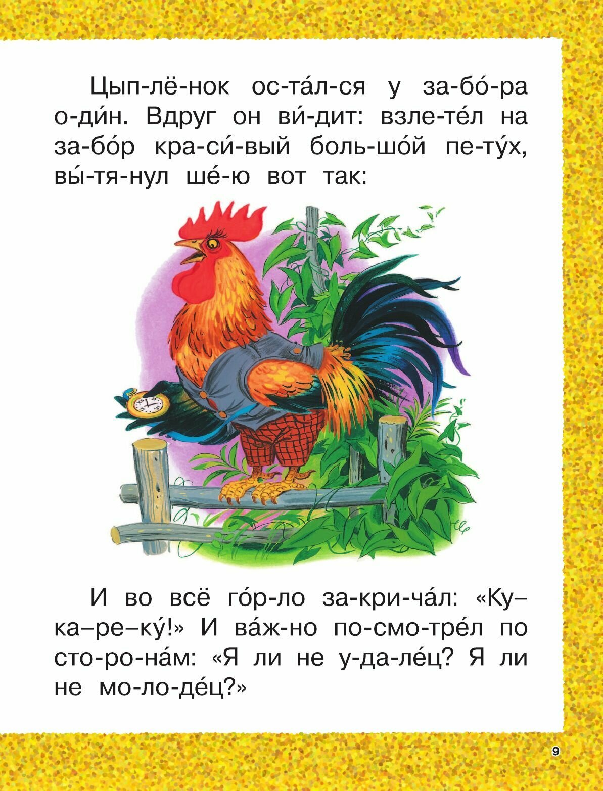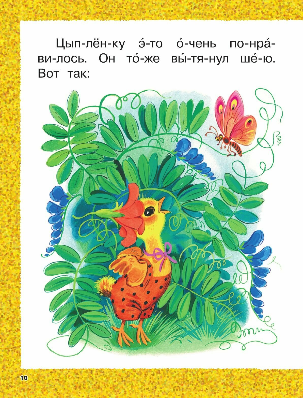 Начинали читать с этой книги. Дочке понравилось. Красочные иллюстрации на каждой странице. Очень крупный шрифт (редко такой встречала), мало текста на странице. Про цыпленка очень понравилось и "Сказка о глупом мышонке". По слогам дочь читала месяца 2, поэтому книгу теперь не используем. Считаю, что это единственный минус книги. При этом на момент, когда читала по слогам, не была способна прочитать больше двух строк.